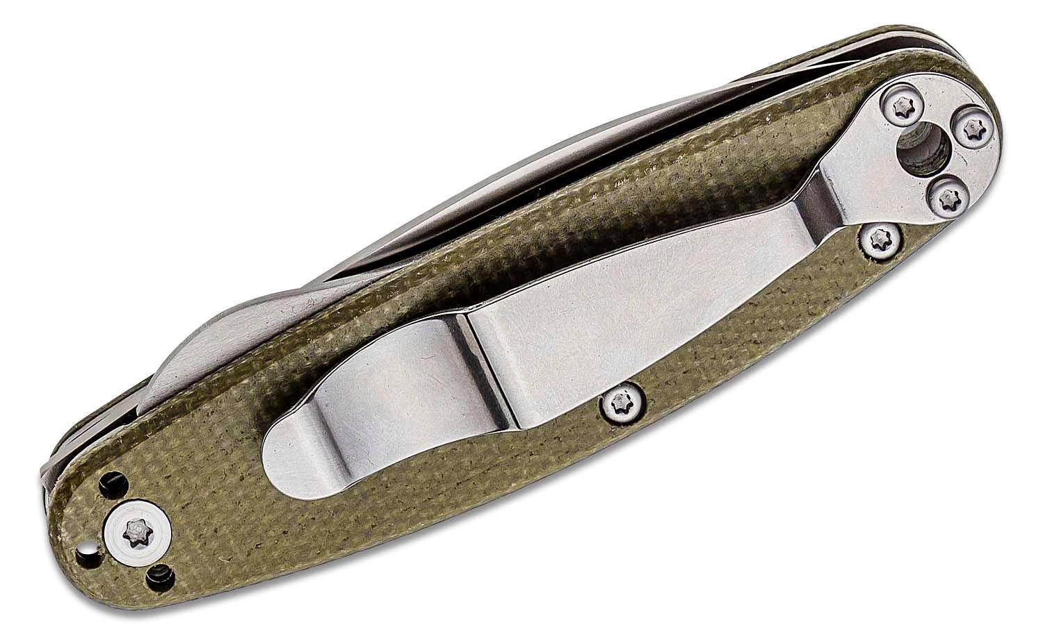 De teksturerede Micarta-skaller i grøn giver sikker håndtering også i fugtige forhold. Den praktiske lommeclip muliggør diskret bæring, mens snorhullet tilføjer en ekstra måde at sikre kniven og få hurtig adgang.