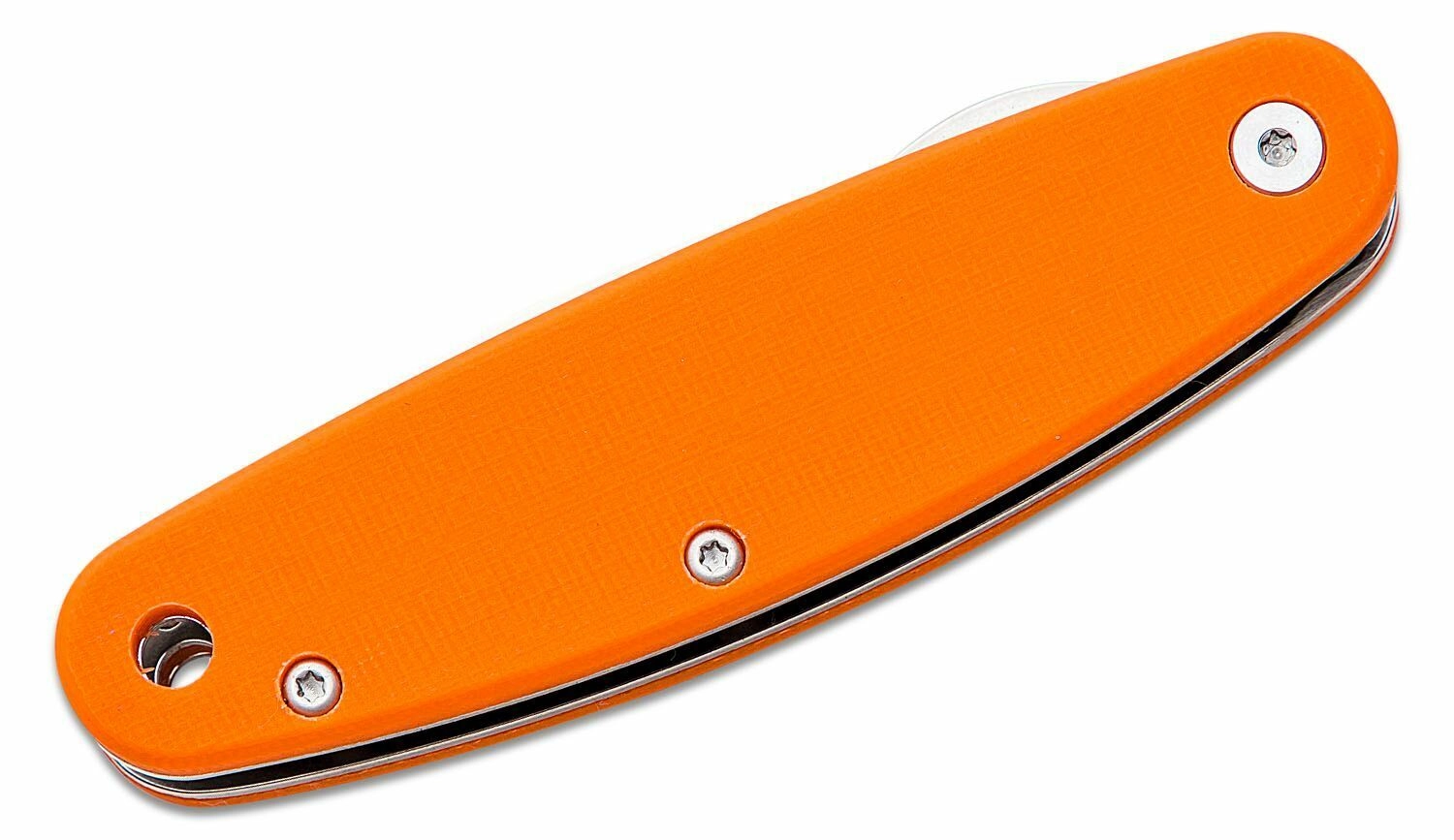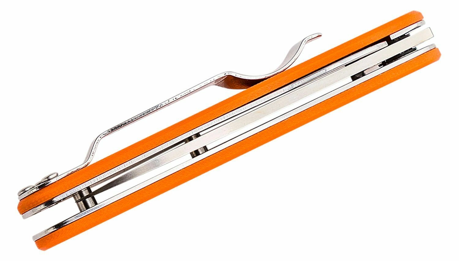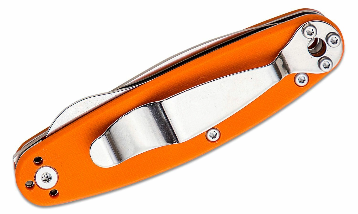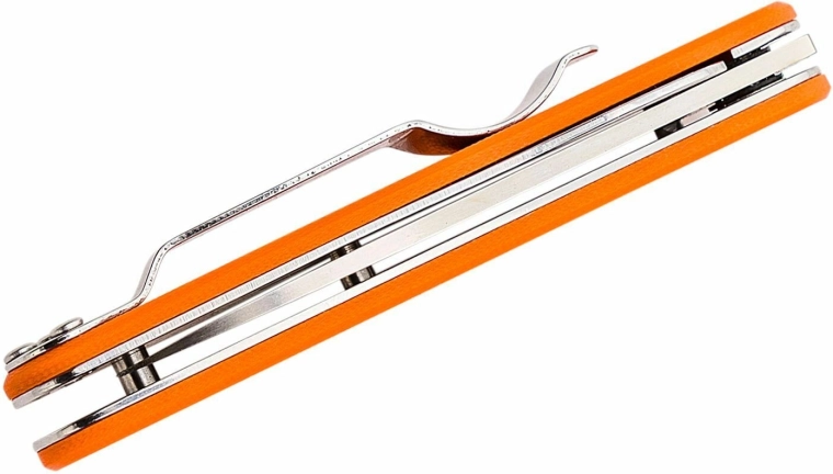 Orange G10-skaller med metalforinger giver sikkert greb og høj holdbarhed i daglig brug.