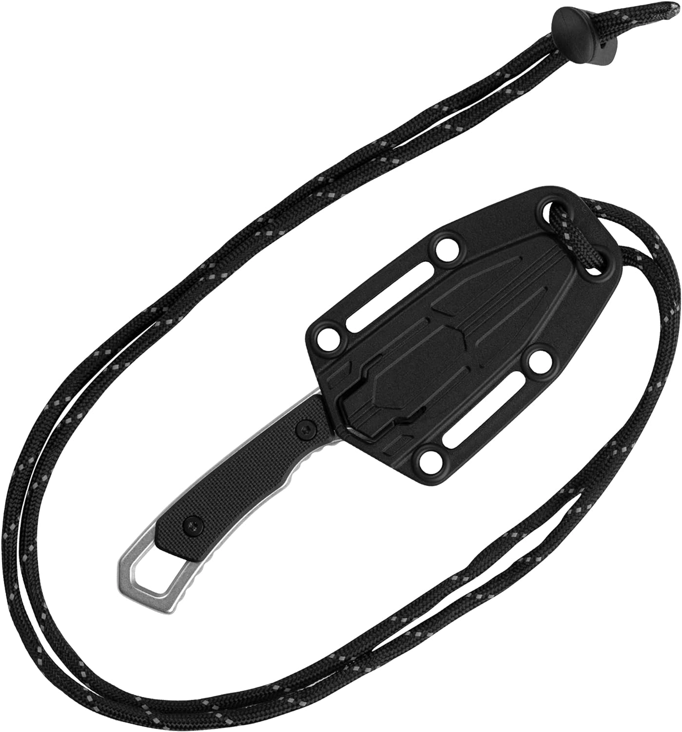 Det ergonomiske greb i sort GFN (glasfiberforstærket nylon) giver et sikkert hold og fremragende kontrol under arbejdet. Der medfølger en let plastskede og en paracordsnor til diskret og sikker bæring om halsen.