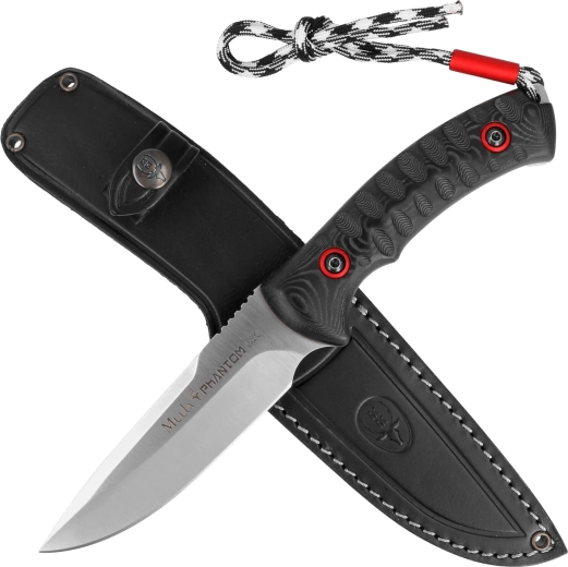 Robust universalkniv Muela Phantom med en bladlængde på 12 cm er ideel til outdoor, jagt og taktisk brug. Den byder på full-tang konstruktion, klinge af rustfrit stål 1.4116, ergonomisk micarta-håndtag med skridsikker tekstur og en praktisk paracord-snøre. Medfølger gør en kvalitets læderskede til sikker bæring.
