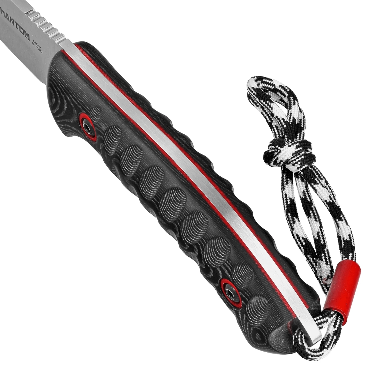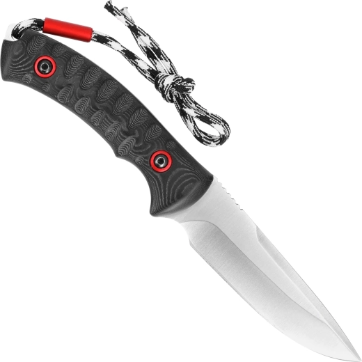 Tekstureret sort micarta med røde indlæg og riflet tommelfingerstøtte på ryggen giver kontrol selv i vådt miljø. Paracord-snøren gør håndtering nemmere.