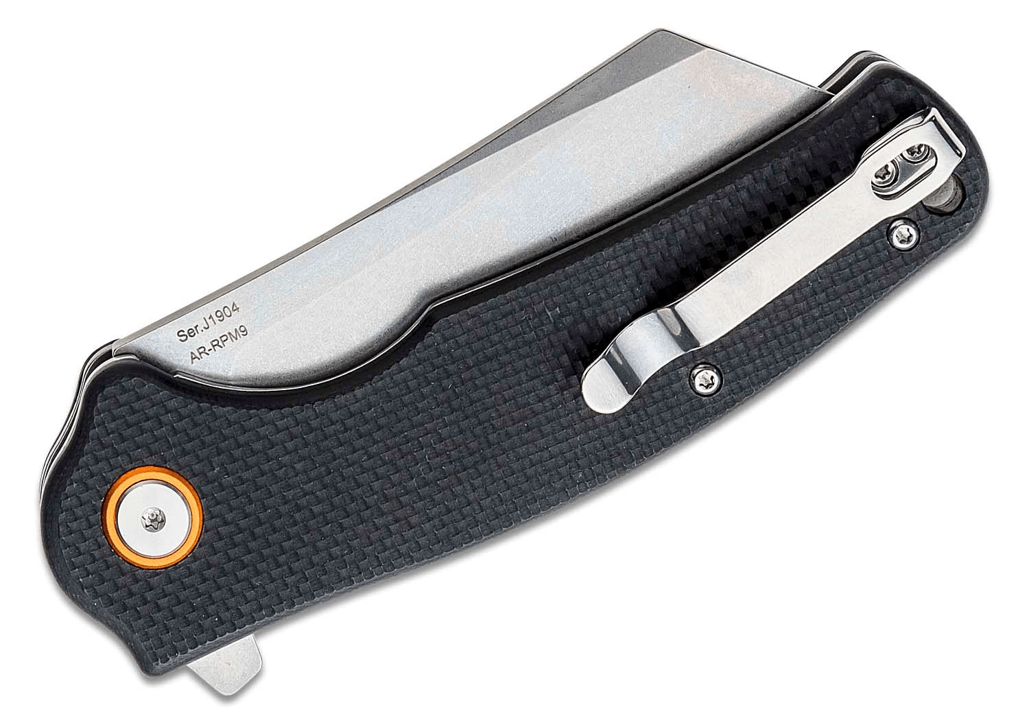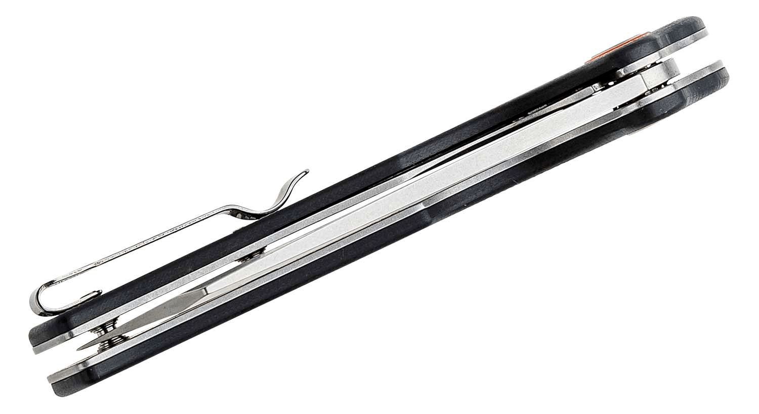 Tekstureret sort G10 for sikkert greb, lommeclip og snorhul for diskret og tryg bæring.