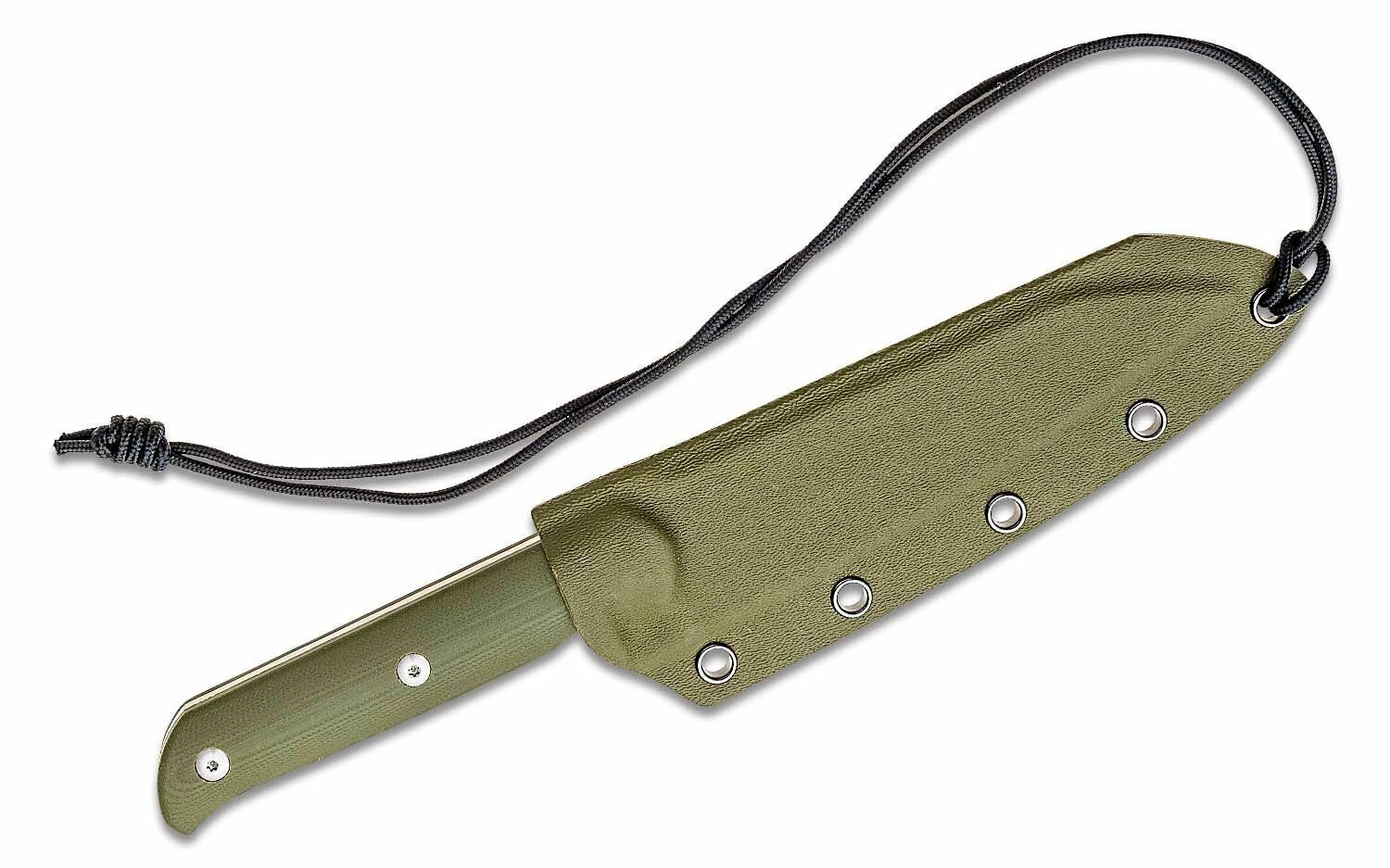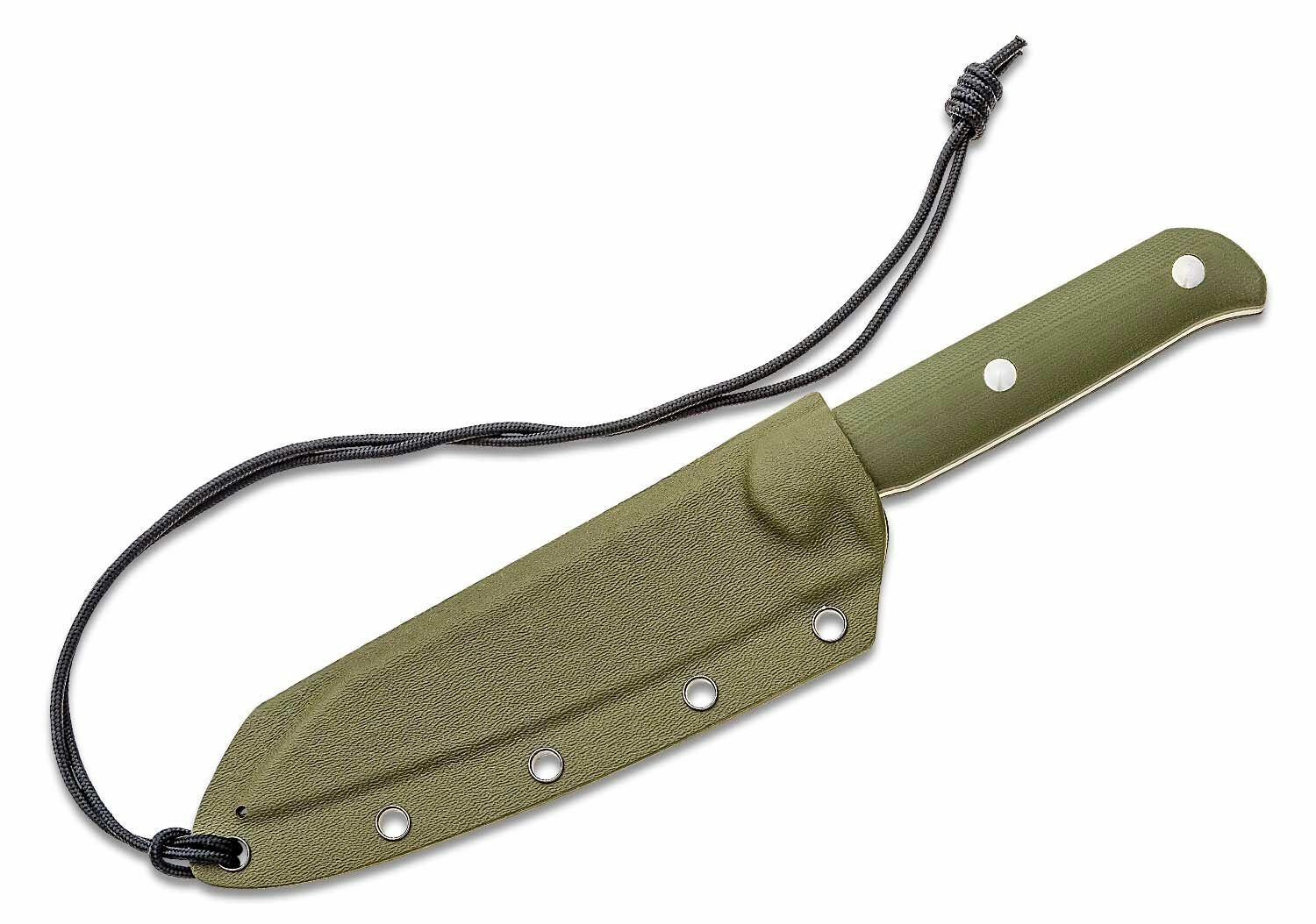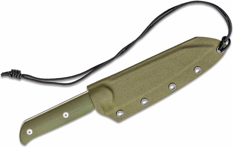 Det ergonomiske G10-skæfte i grøn er sikkert fastgjort med tre rustfri nitter og giver et fast greb selv under krævende forhold. Pakken indeholder en Kydex-skede med flere monteringspunkter og en snor til nem ophængning eller transport.