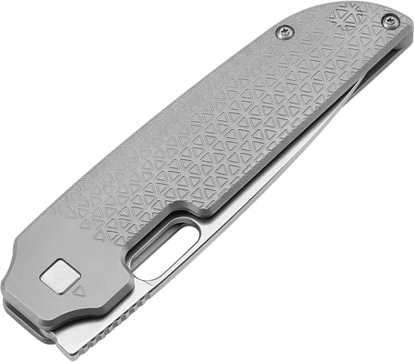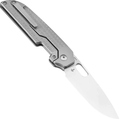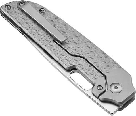 Let og stærk titanium med fræset geometrisk mønster giver stabilitet i hånden og lang levetid. Deep-carry clip til diskret bæring.