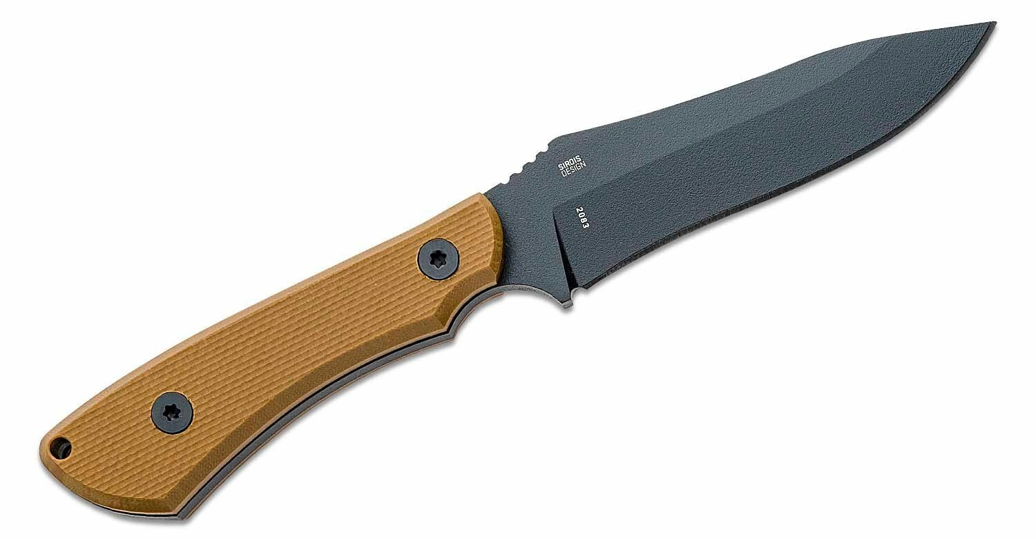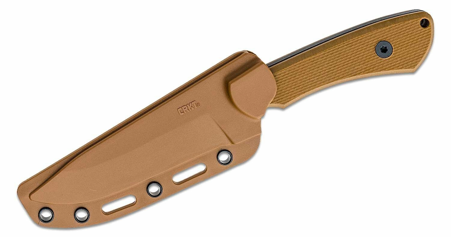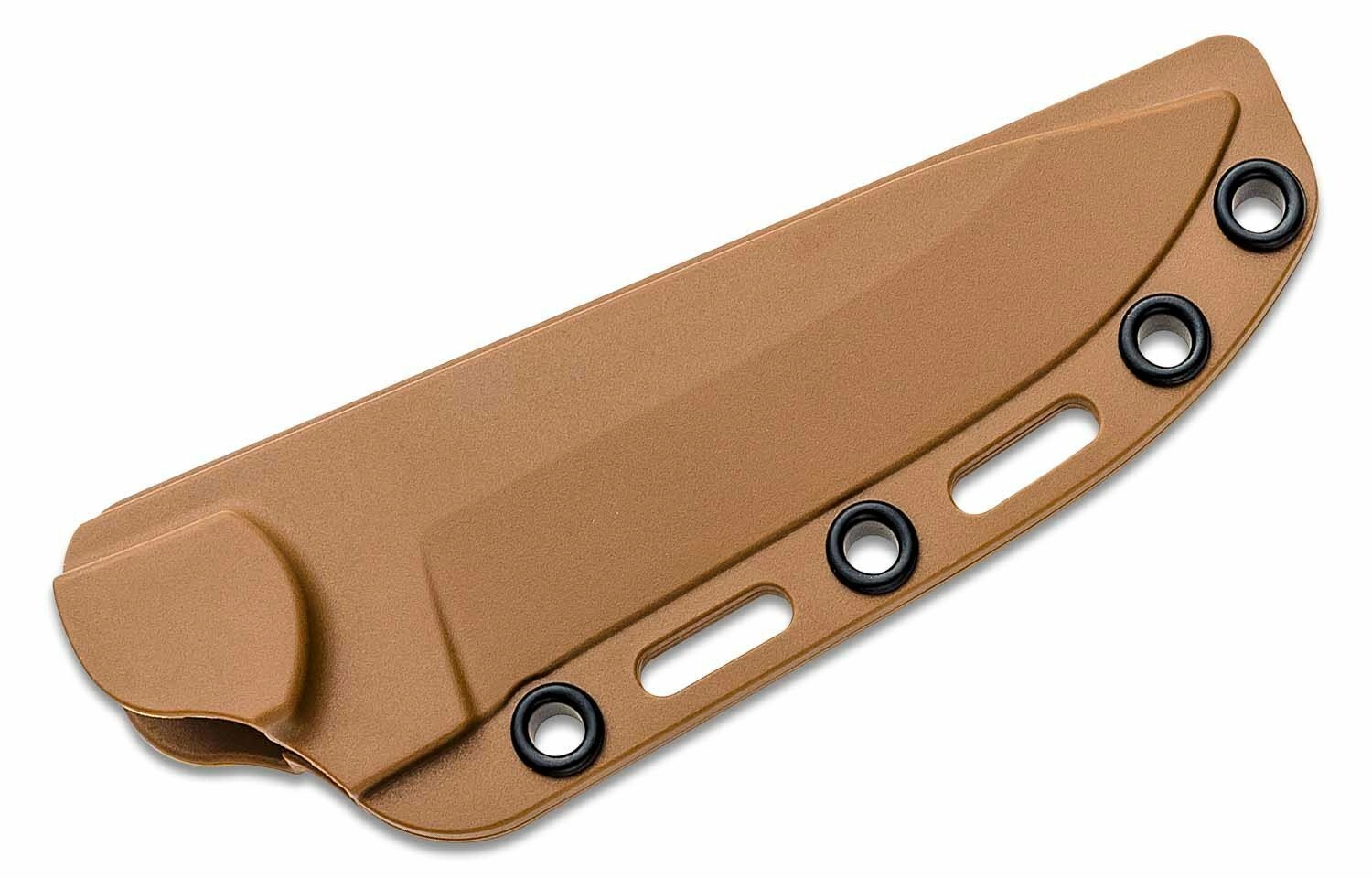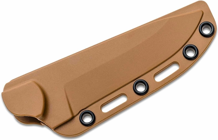 Det ergonomisk formede håndtag i G10 i farven coyote brown har en aggressiv tekstur for sikkert greb i håndfladen, både med handsker og i vådt miljø. Gennemtænkt rifling (jimping) på klingens ryg øger kontrollen ved præcise snit. Kniven leveres med en let, men meget holdbar plastskede med flere huller til fleksibel montering – på bælte, MOLLE eller skjult bæring.