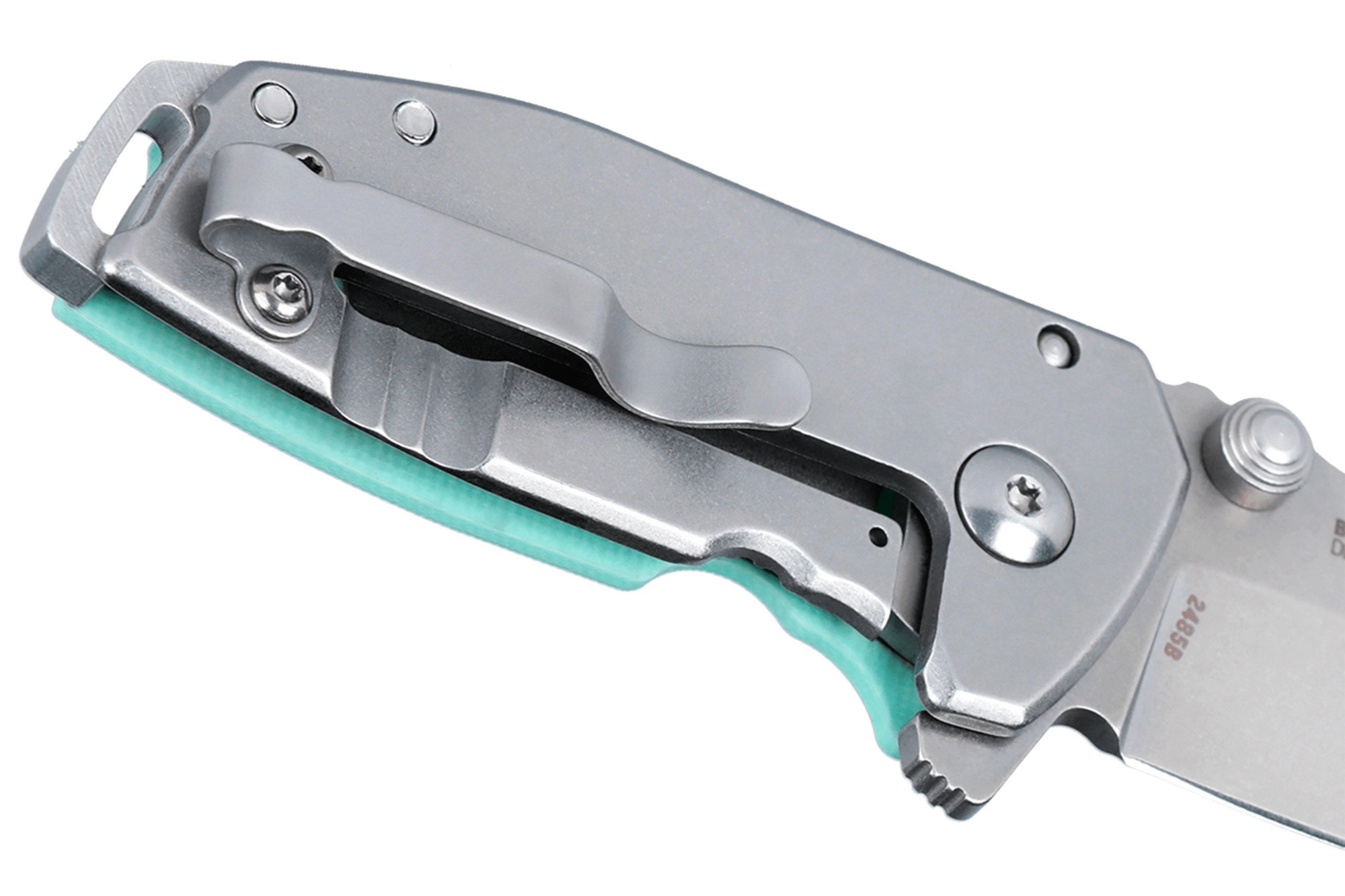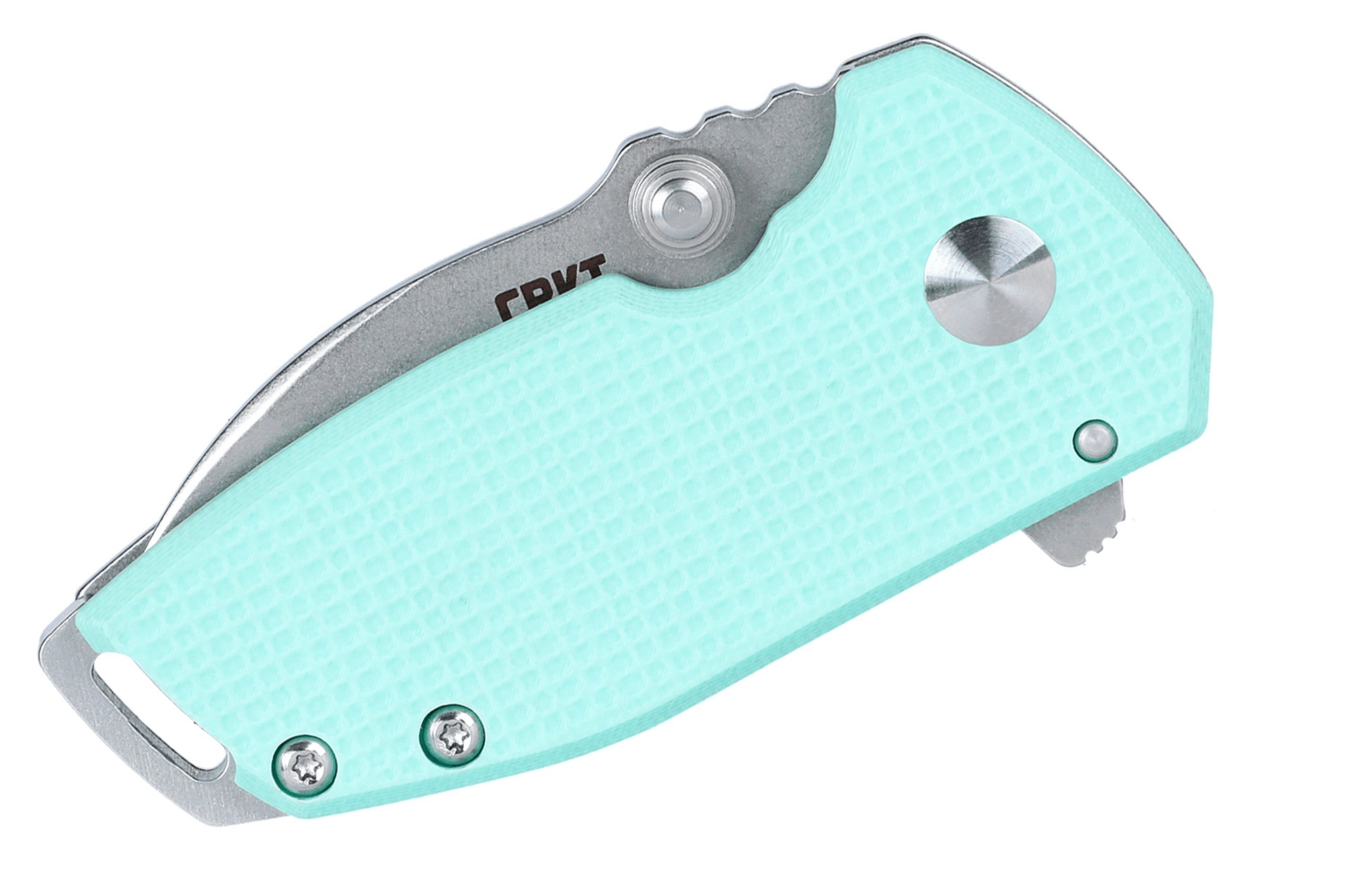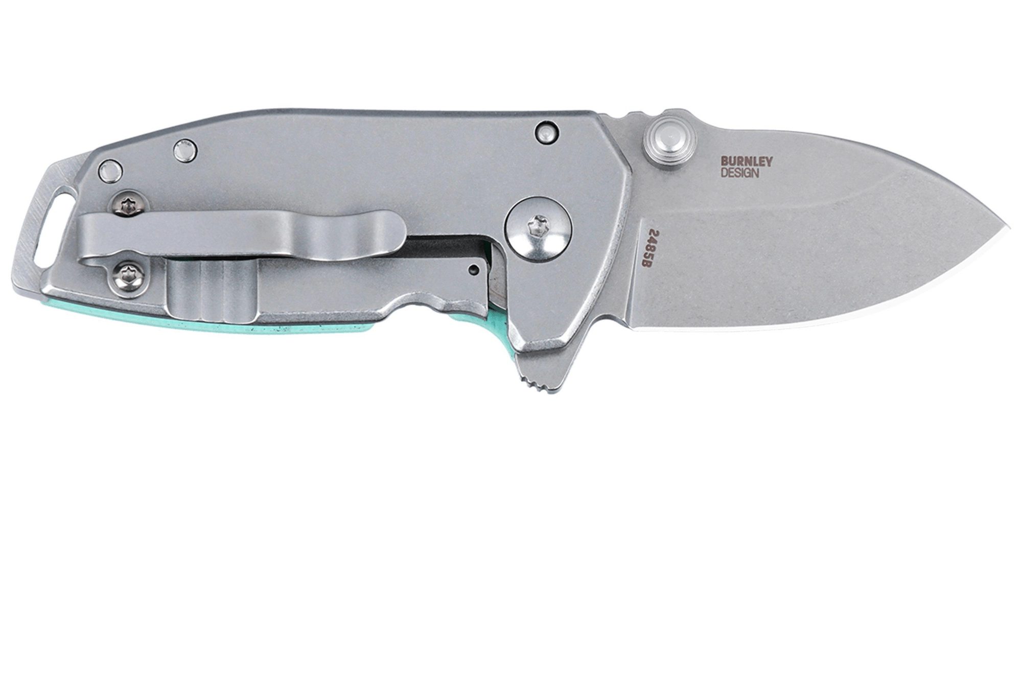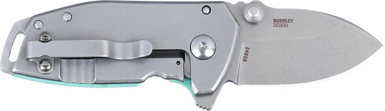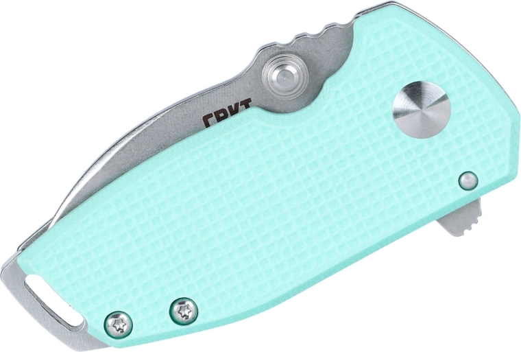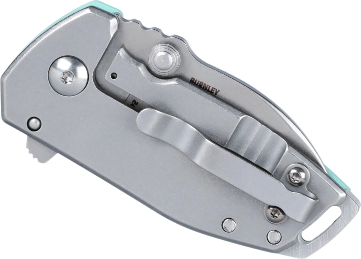 Det ergonomiske håndtag kombinerer tekstureret G10 i lyseblå med rustfrit stål for et sikkert greb og lang levetid. Der medfølger lommeklip, hul til snor og kompakte mål, som gør kniven til et diskret og pålideligt EDC-værktøj.