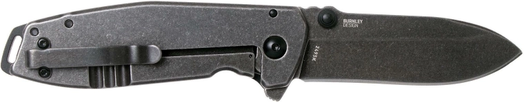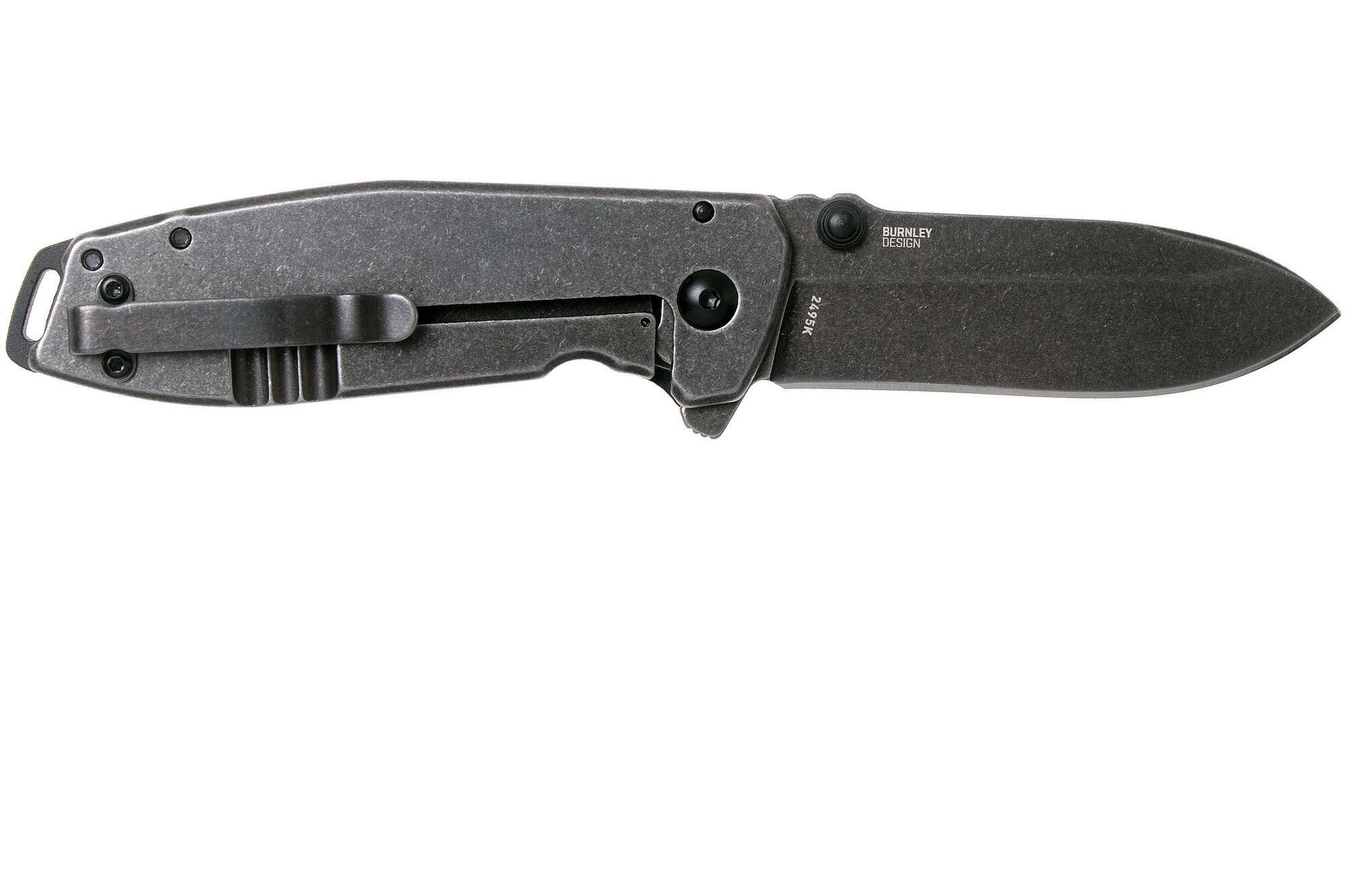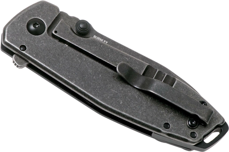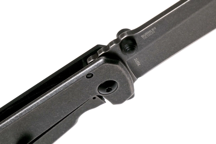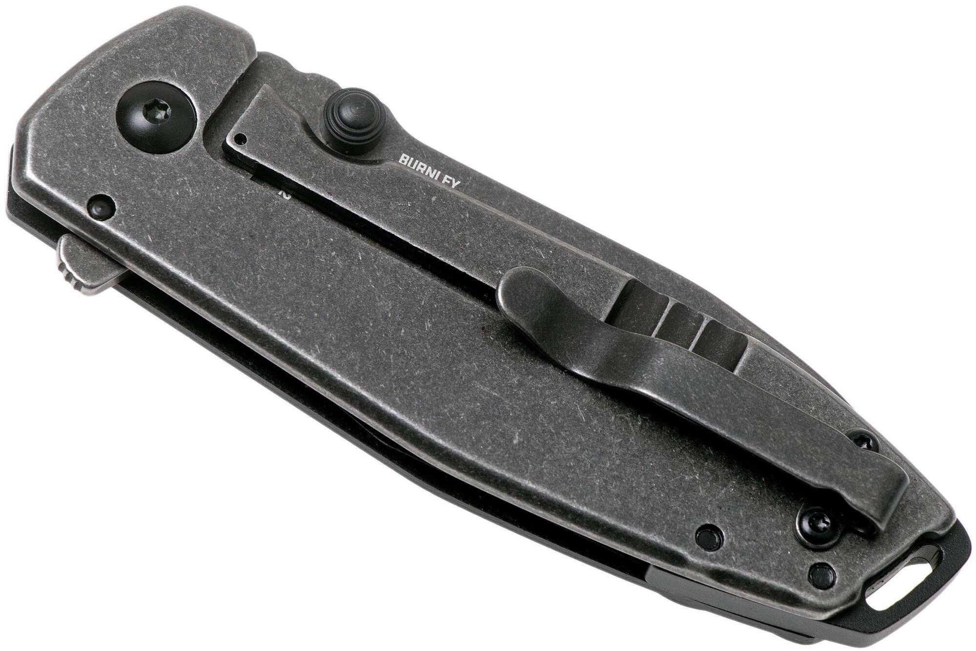 Værktøjsstålet D2 holder skæret længe, og Black Stonewash-overfladen reducerer synligt slid.