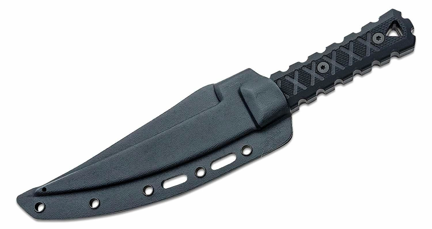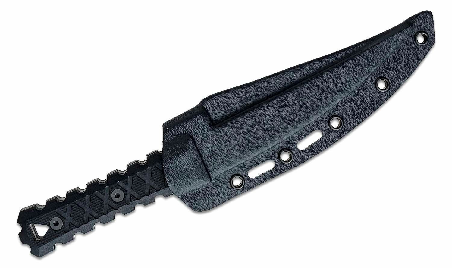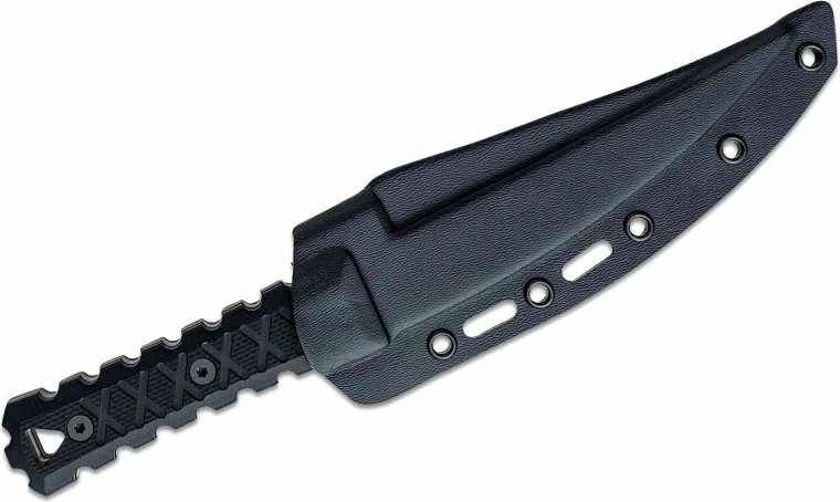 Den formstøbte skede med flere huller og slidser muliggør forskellige monteringsmetoder på bælte eller udrustning og sikrer sikker transport af kniven.