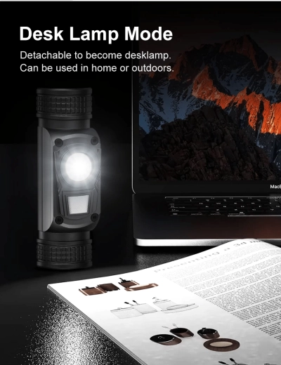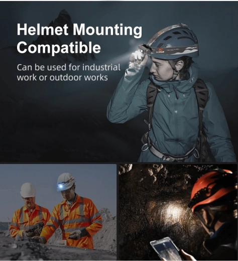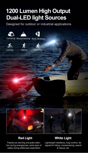 - 3 lyskilder: hoved-LED (op til 1200 lm), side-COB LED 4000K, rød LED (konstant lys, blink, SOS)