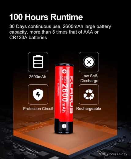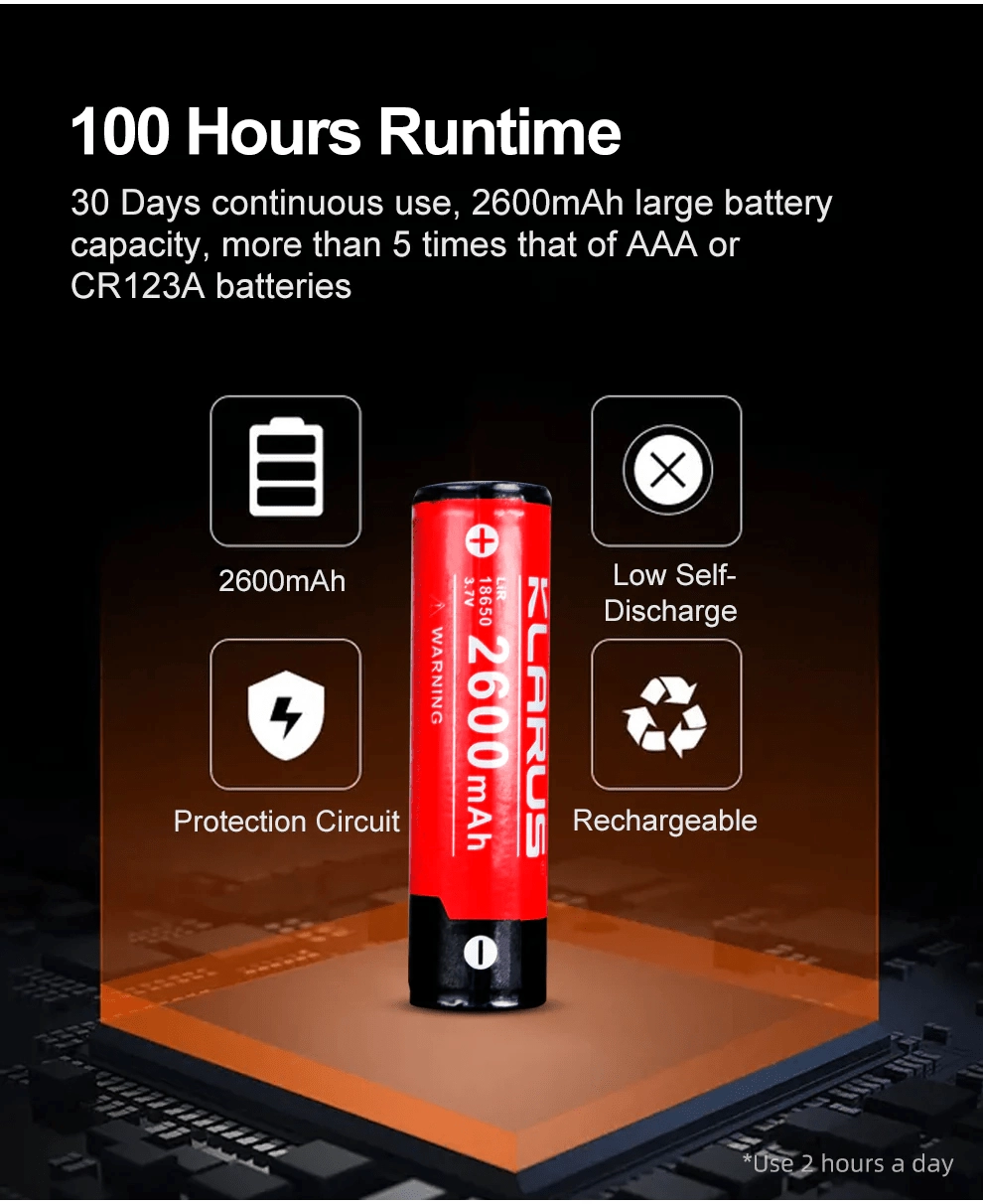 - Driftstid op til 100 timer med 18650 2600 mAh batteri (inkluderet)