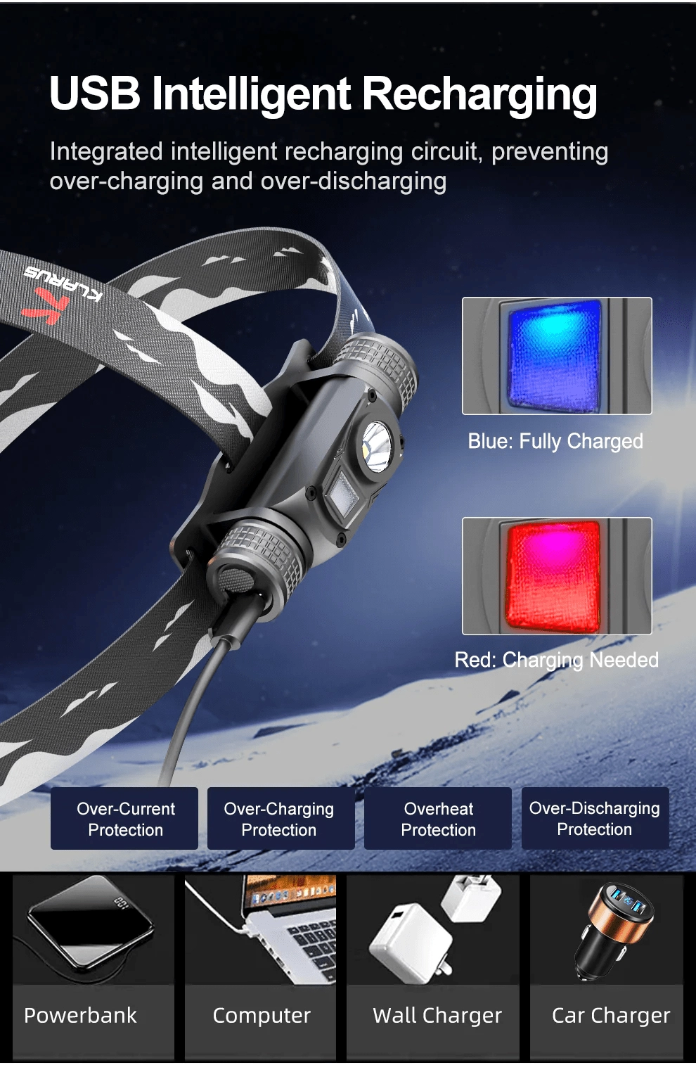 Takket være smart USB-opladning med beskyttelse mod overopladning og dybdeafladning er driften sikker og pålidelig. Huset af hærdet flyaluminium 6061‑T6 tåler vand efter IPX6 samt fald fra 1 m. Pandelampen kan nemt tages af remmen og bruges som bordlampe.