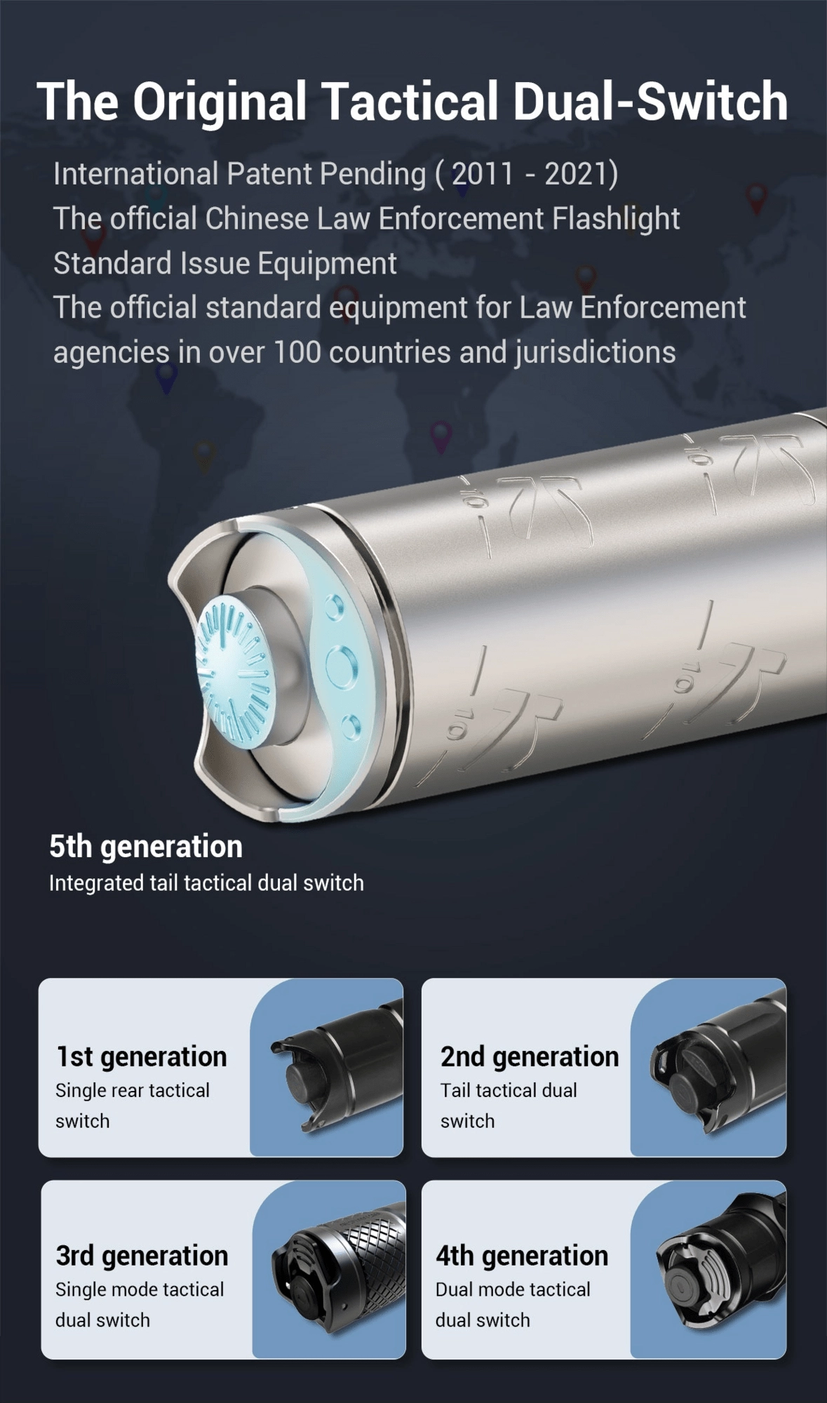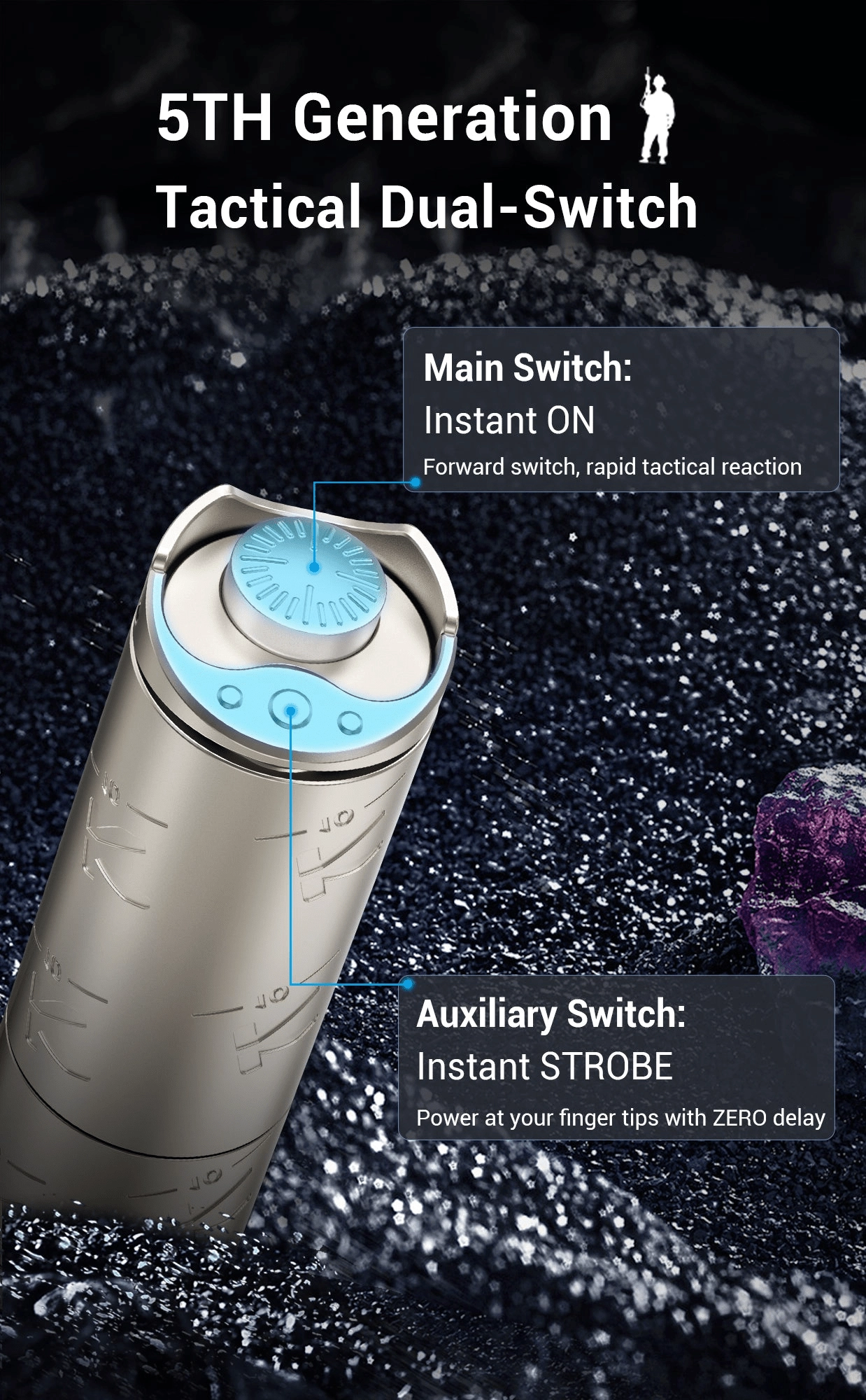 Betjeningen sikres af en dobbelt taktisk kontakt i enden af lygten for hurtig adgang til 4 tilstande, strobe og SOS. Strømforsyningen håndteres af et 16340 Li‑ion batteri med Micro USB opladning (inkluderet), alternativt kan der bruges 1× CR123A. Et termisk beskyttelsessystem holder optimal temperatur for den bedste balance mellem ydelse og sikkerhed, mens IPX8 sikrer høj modstandsdygtighed over for vand.