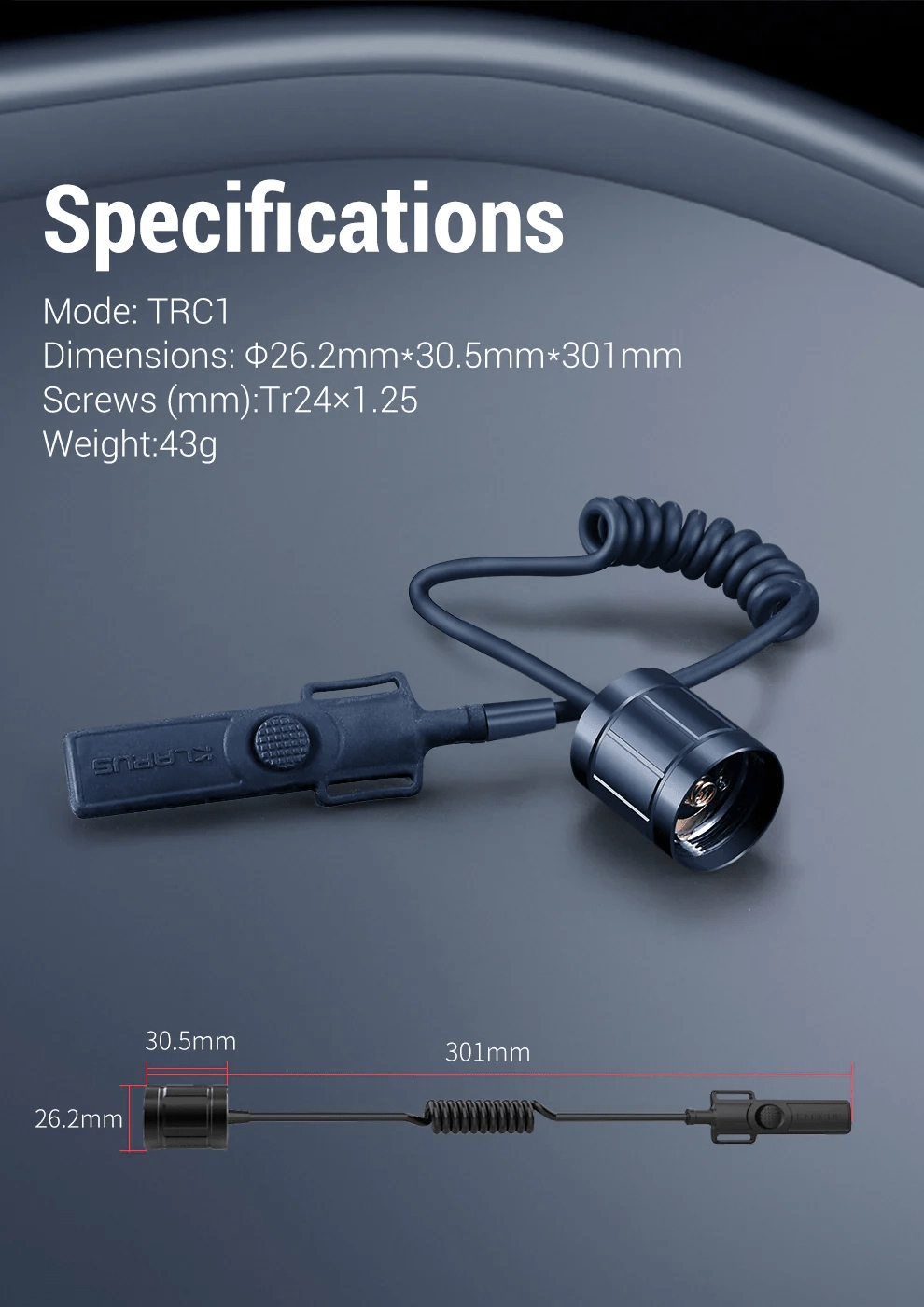Den fjernbetjente kabelafbryder Klarus TRC1 giver hurtig og pålidelig betjening både taktisk og i felten. Den har to separate kontakter – en rund knap til øjeblikkeligt 100% lys (momentan og konstant), og en aflang knap til øjeblikkelig STROBE. Kompatibel med lygterne XT11GT PRO V2 og XT2CR PRO, med en robust PU-kabel og en levetid på op til 100.000 tryk.