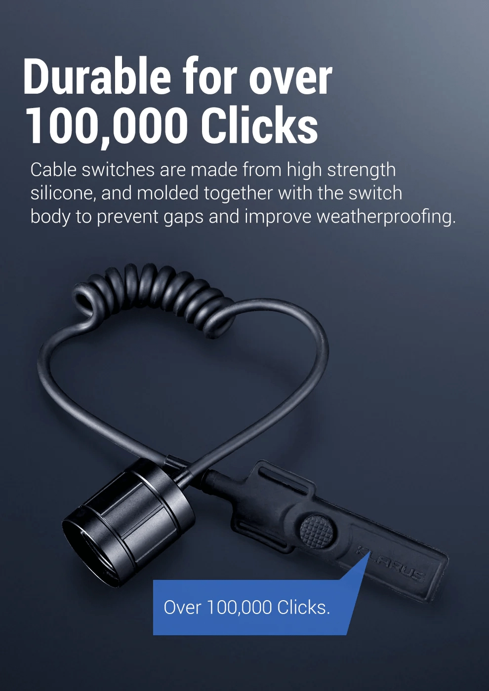 Afbryderen er designet med fokus på holdbarhed og pålidelighed. Det højstyrke PU-spiralkabel tilpasser sig fleksibelt forskellige længder (ca. 30–50 cm) og taktiske greb. Silikoneknapperne er støbt direkte ind i afbryderens hus, hvilket minimerer sprækker og øger modstandsdygtigheden over for vejrpåvirkninger. En levetid på op til 100.000 klik sikrer langvarig, problemfri brug.