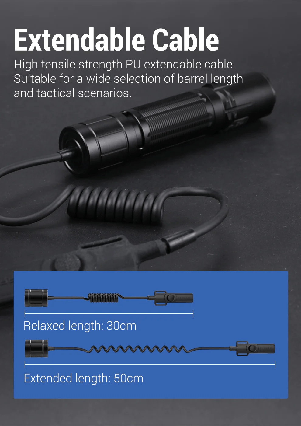 - Taktisk fleksibilitet – udtrækkeligt PU-kabel til forskellige monteringspositioner.