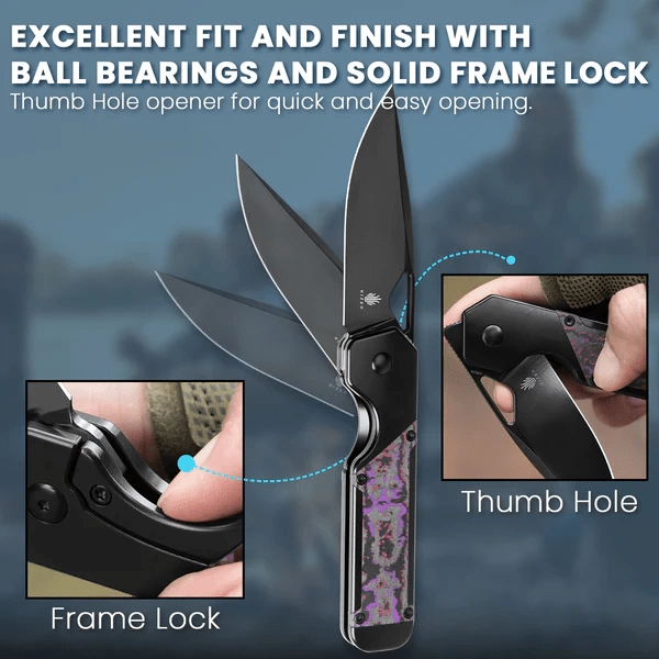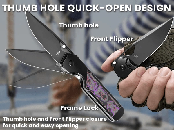 Flipper og tommelfingerhul muliggør lynhurtig én-håndsåbning, mens framelock låser klingen sikkert under arbejde.