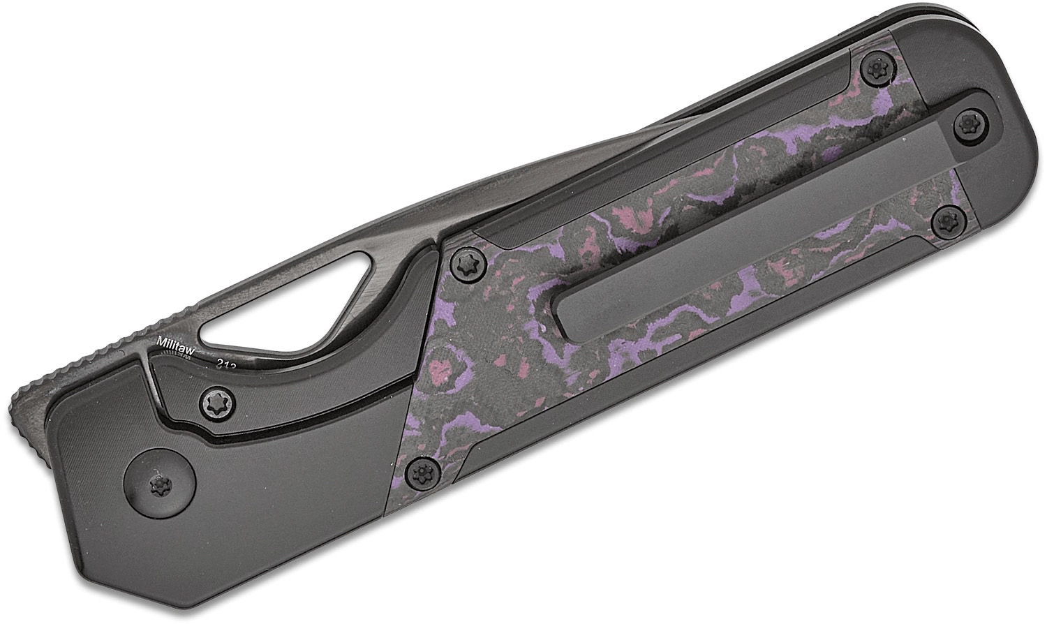 Let og stærkt titaniumskaft med dekorativ Fatcarbon Purple Haze-indlæg og dybbæret lommeklip for komfortabel bæring.