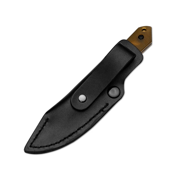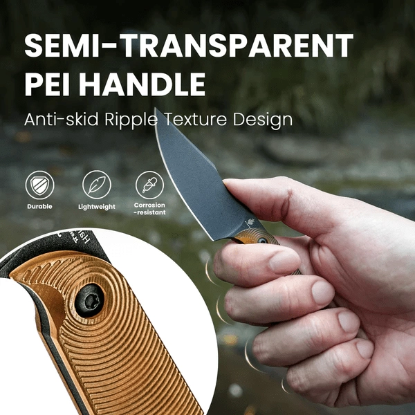 Skæftet i Ultem PEI er ikke blot holdbart og let, men også halvtransparent, så de indvendige indlæg med det elegante “capsule”-mønster ses. Skæfteudformningen og den skridsikre tekstur giver et sikkert greb selv i vådt føre. I pakken medfølger en Kydex-skede med kulfiberlook for sikker og komfortabel bæring i bælte eller på udrustning.