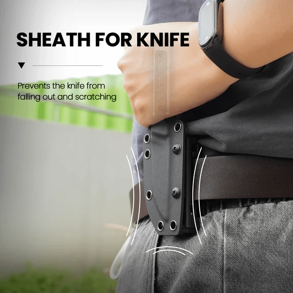 Den hårde, formstøbte skede med bælteklips beskytter klingen og muliggør hurtig og sikker trækning samt fleksibel montering på udstyr.