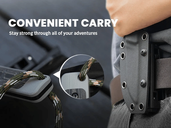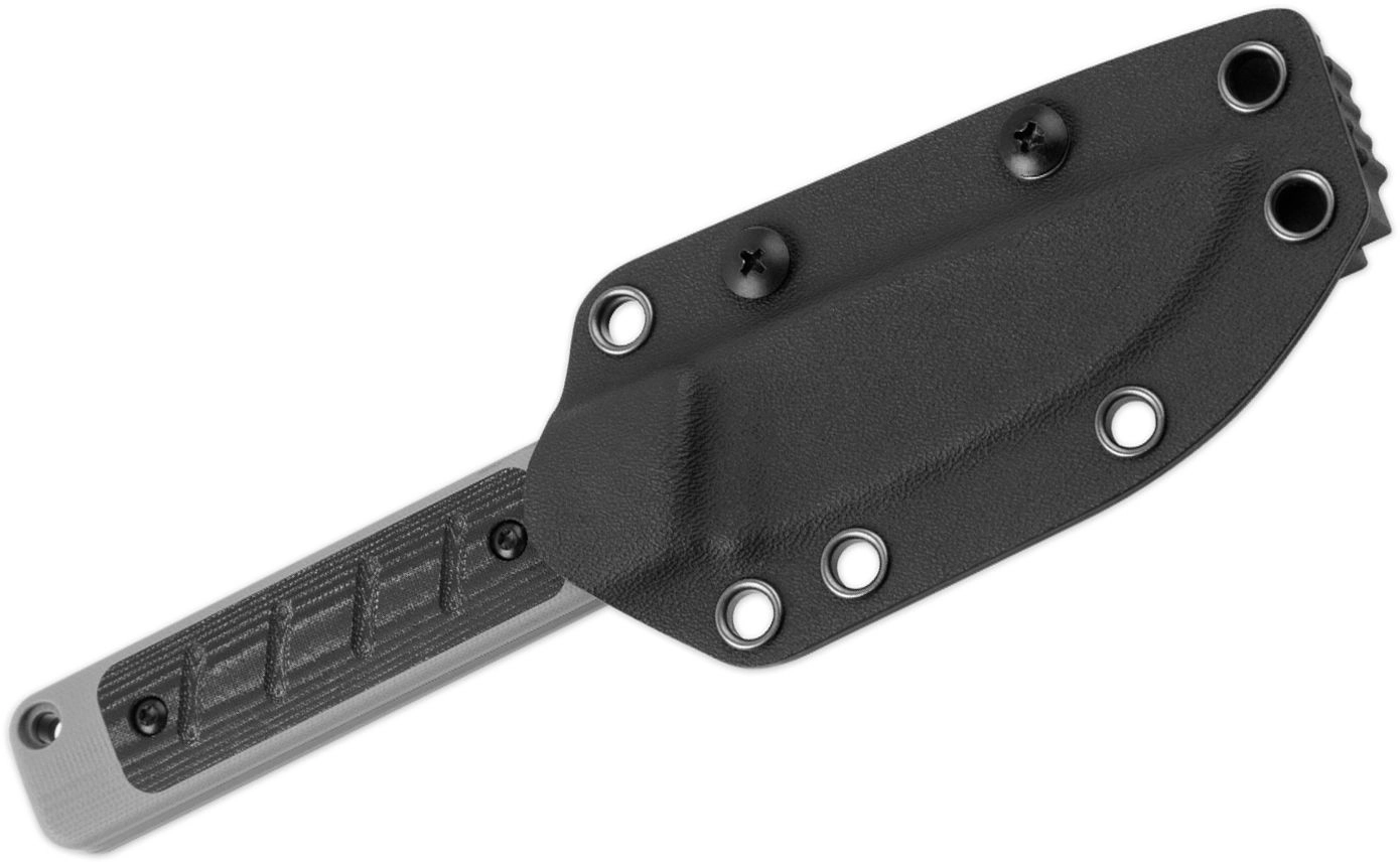 Skaftet i G10 med Micarta-beskyttelse giver et sikkert, skridsikkert greb selv i vådt vejr. Full-tang konstruktion og hul til snor øger sikkerheden og kontrollen over kniven. Med i pakken følger en formstøbt Kydex-skede med mulighed for bæltemontering, som beskytter klingen og gør daglig bæring nemmere.