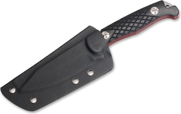 Greb i G10 med skridsikker tekstur inspireret af fiskeskæl sikrer et sikkert greb, også i vådt vejr. Dekorative røde lag giver kniven et attraktivt udseende. Den praktiske Kydex-skede med bælteadapter muliggør komfortabel og sikker bæring både i terrænet og i byen.