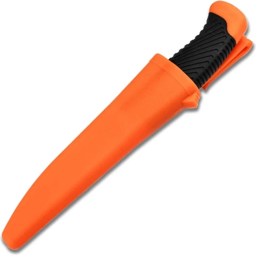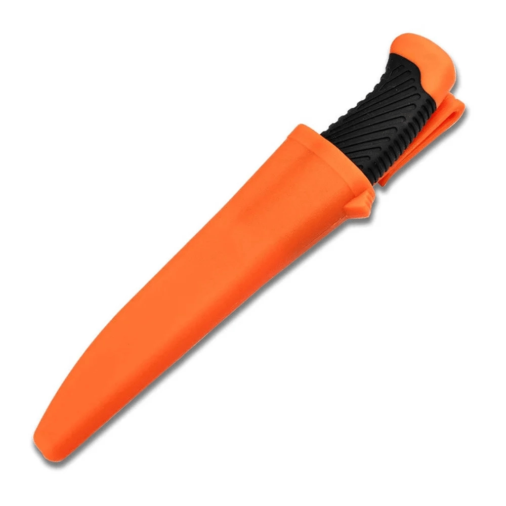 Det orange håndtag med tekstureret, skridsikker gummioverflade sikrer et sikkert og behageligt greb, selv i våde omgivelser. Den robuste plastskede er beskyttet mod gennemboring og gennemskæring, har en integreret klips til nem fastgørelse i bæltet og et drænhul til bortledning af fugt.