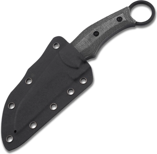 Håndtaget i sort Micarta er formet for et komfortabelt og sikkert greb, selv under krævende forhold. Finger-ringen forbedrer håndteringen og fungerer også som hul til snor. Kydex-skeden med clip muliggør diskret og pålidelig bærekomfort i bæltet.