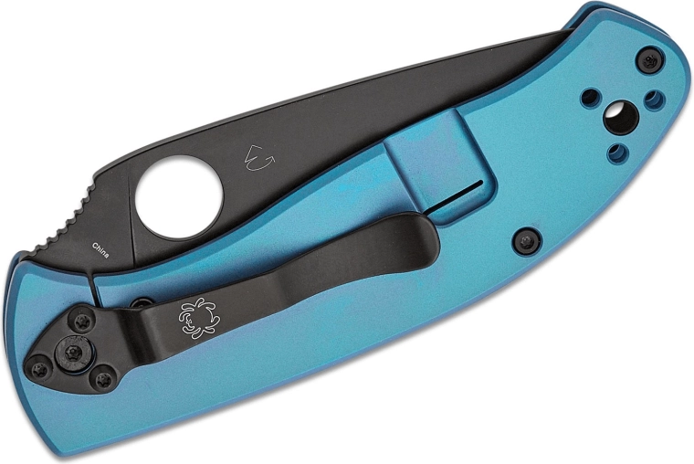 Kompakt EDC-kniv SPYDERCO Tenacious Blue med 8,5 cm sort klinge i 8Cr13MoV-stål og blåt titaniumskaft. Tilbyder ét-hånds åbning via tommelfingerhul, sikker låsning med RIL (frame lock) og clips med 4 positioner for behagelig daglig bæring.