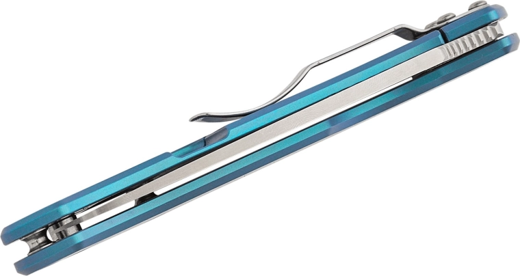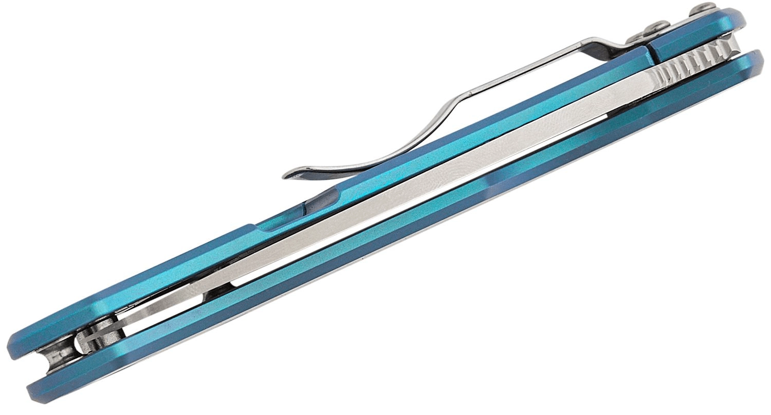 Det blå titaniumhåndtag er let, robust og ligger behageligt i hånden. Lommeclippen kan indstilles i fire positioner (tip-up/tip-down, højre/venstre), så du kan tilpasse kniven præcist til din bærestil. Det praktiske snorhul i enden af håndtaget gør det nemt at sikre kniven eller trække den hurtigt op af lommen.