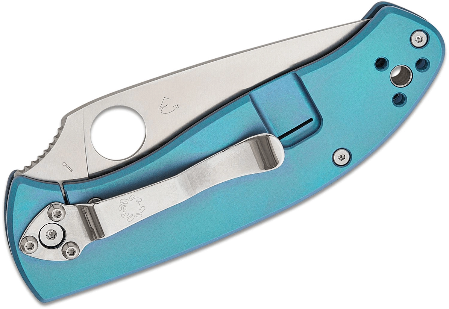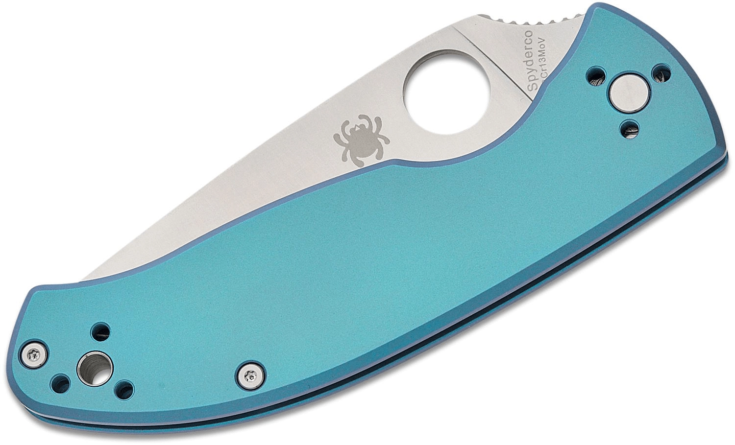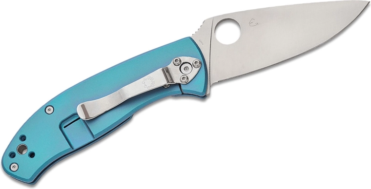 Elegant EDC-kniv Spyderco Tenacious Blue med satineret klinge på 8,5 cm af 8Cr13MoV-stål og titaniumhåndtag. Byder på enhåndsbetjent åbning via tommelfingerhul, sikker lås R.I.L. (Reeve Integral Lock) og firepositions lommeclip for behagelig bæring.