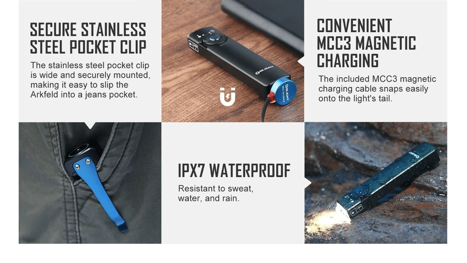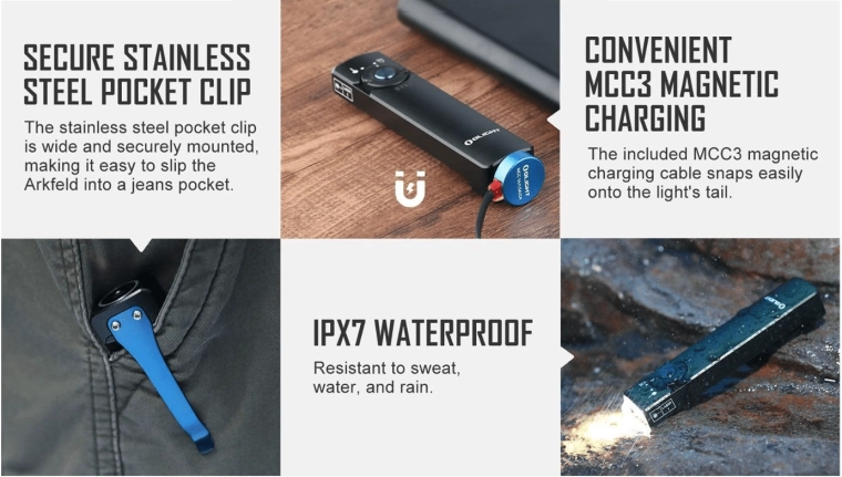 Betjeningen er intuitiv – centralknappen suppleres af en praktisk tilstandsvælger og en hukommelsesfunktion for hurtig tilbagevenden til din foretrukne lysstyrke. Det indbyggede Li-Pol batteri 1050 mAh holder op til 8 dage afhængigt af tilstand og oplades bekvemt via det magnetiske USB-kabel MCC3. IPX7-klassificeringen beskytter lommelygten mod vand og dårligt vejr.