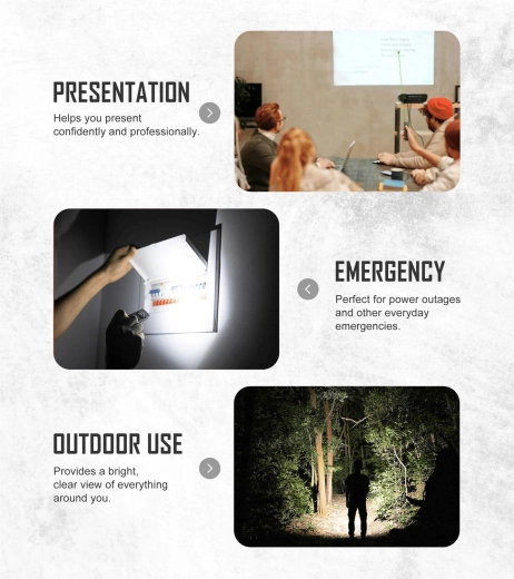 Det elegante, flade hus med metaltekstur og stålklips sikrer et sikkert greb, nem lommebæring og hurtig fastgørelse på bæltet. Maksimal lysstyrke 1.000 lumen og rækkevidde op til 101 meter giver pålidelig belysning i byen, i værkstedet og i naturen. Den integrerede grønne laser er praktisk til præsentationer og sjov med kæledyr.