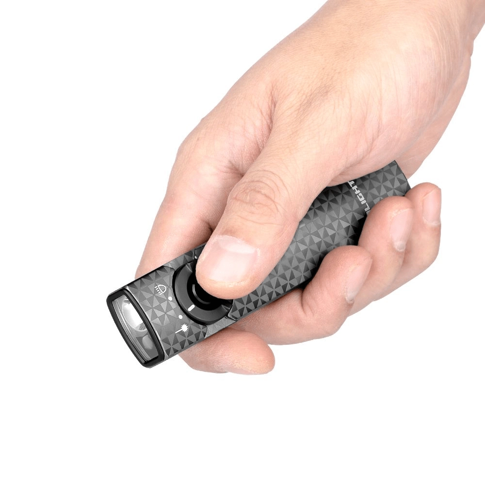 Kompakt, flad EDC-lommelygte Olight Arkfeld i varianten Pinwheel Gunmetal Grey kombinerer kraftigt LED-lys på 1.000 lm og integreret grøn laser. Takket være fem lysstyrkeniveauer, bekvem betjening med centralknap og vælger, magnetisk opladning MCC3 og IPX7-robusthed er den ideel til daglig brug, arbejde og fritid.