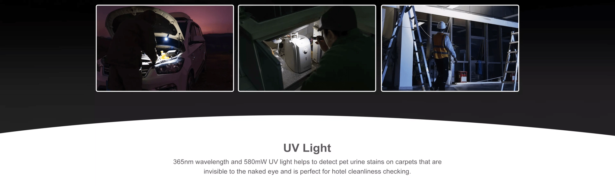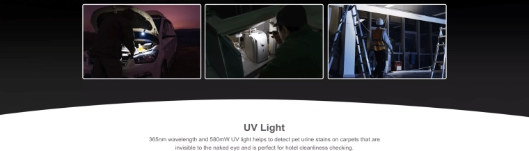 UV-lyset med en effekt på 580 mW kan bruges til verifikation af pengesedler, identifikation af fluorescerende mineraler eller spor af forurening i interiører. Den praktiske udrustning omfatter en tovejs lommeclips med øje til snor, magnetisk bund til fastgørelse på metal og enkel betjening med centralknap og vælger. Opladning via magnetisk USB-kabel MCC1A er hurtig og bekvem.
