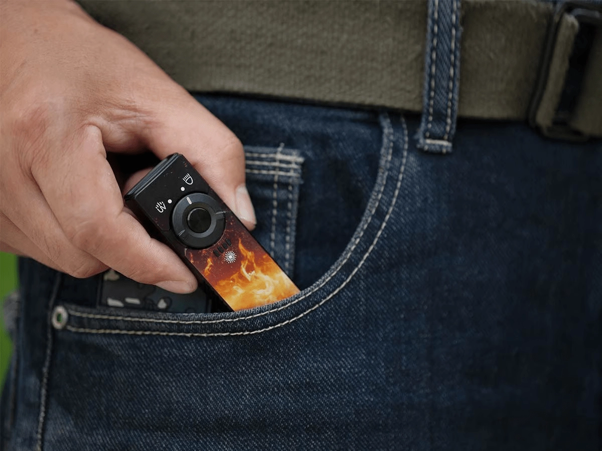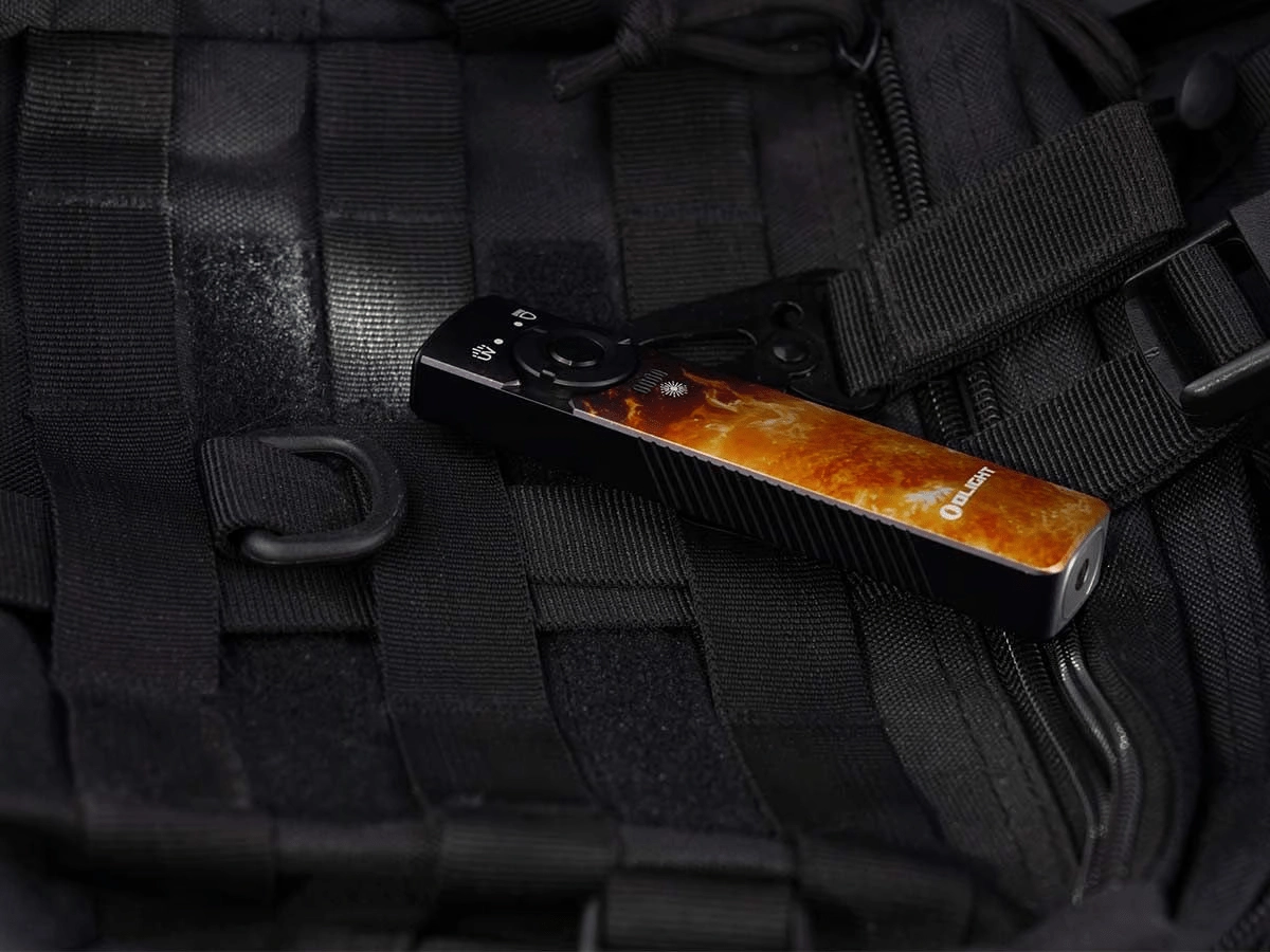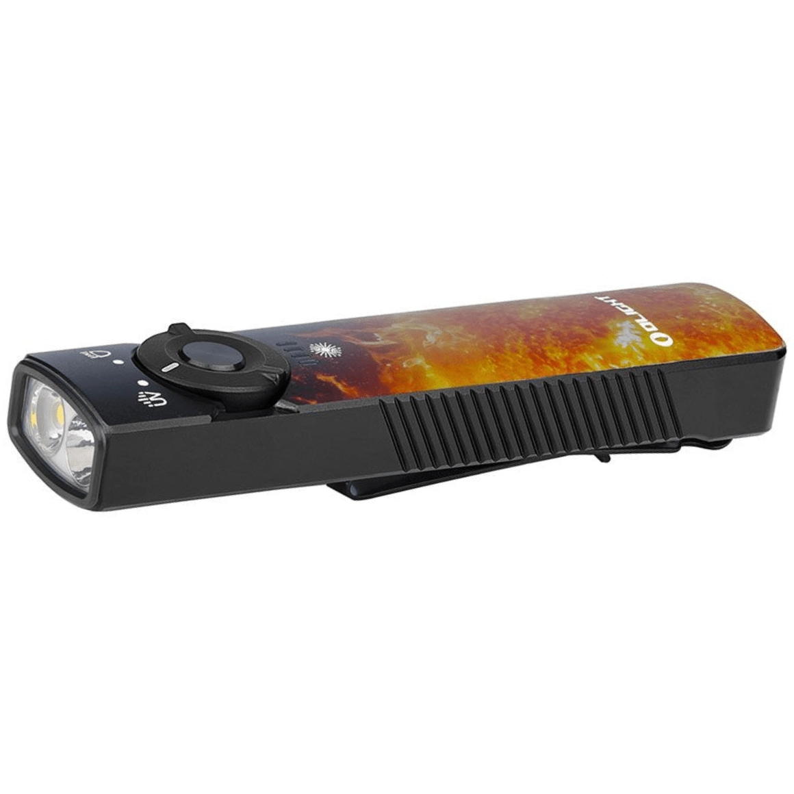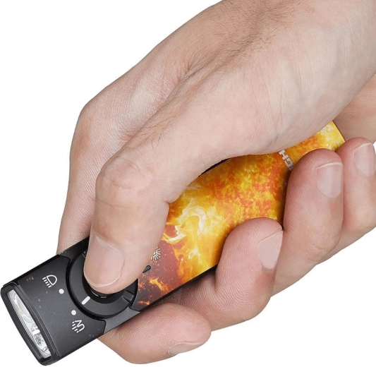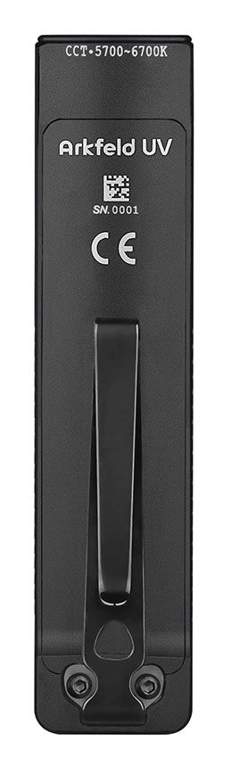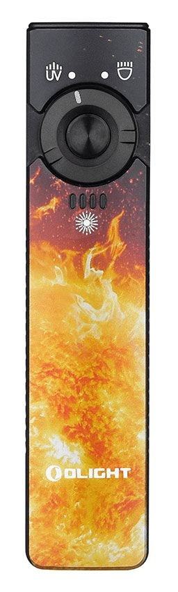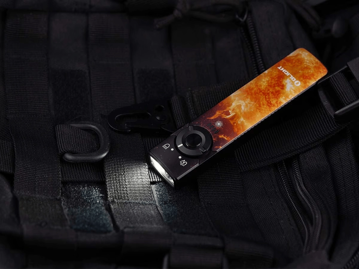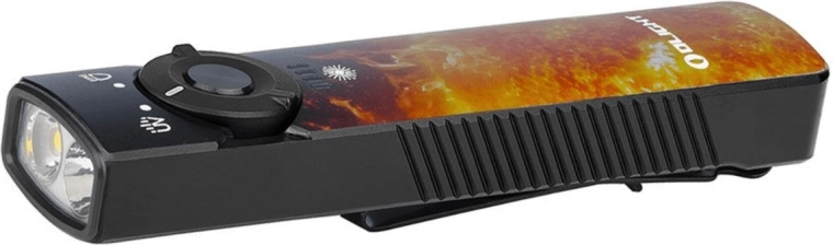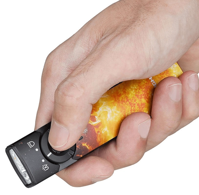 OLIGHT Arkfeld UV Sunburst Limited er en EDC-lygte, der udmærker sig med et unikt fladt hus i aluminiumlegering, fremragende ergonomi og to lyskilder: hvid LED med 5 lysstyrkeniveauer (op til 1.000 lm) og UV-diode 365 nm (580 mW). Nem betjening sikres af en centralknap med funktionsvælger og tydelige indikatorer.