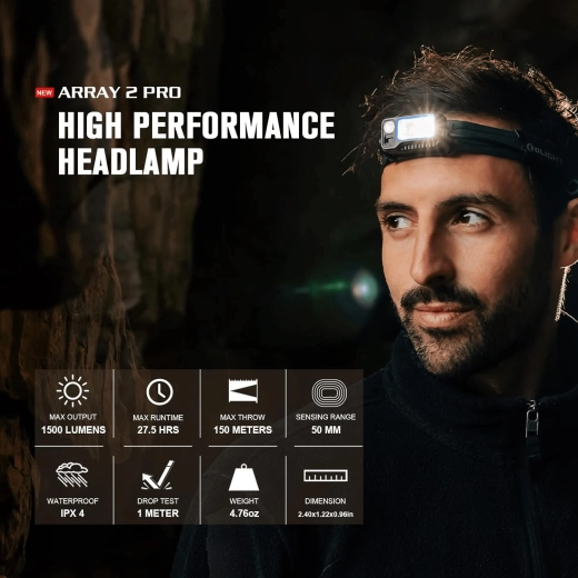 Den kraftige pandelygte OLIGHT Array 2 Pro leverer op til 1500 lm, en kombination af spot + flood med rækkevidde op til 150 m, nem betjening med knap og håndbevægelse samt lang driftstid op til 27,5 timer. Robust IPX4, med USB‑C opladning, rødt lys og let hus i aluminium til daglig brug og outdoor.