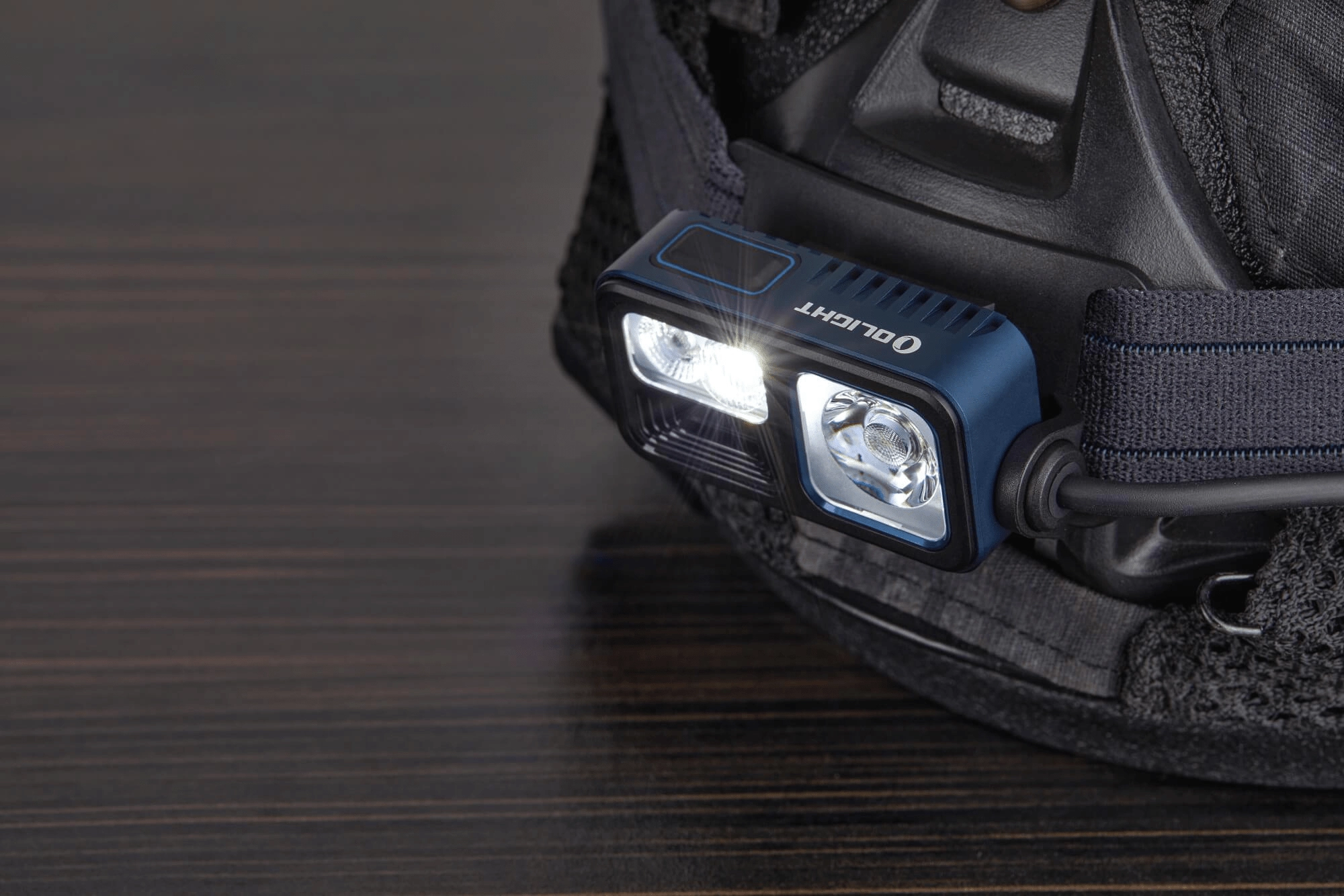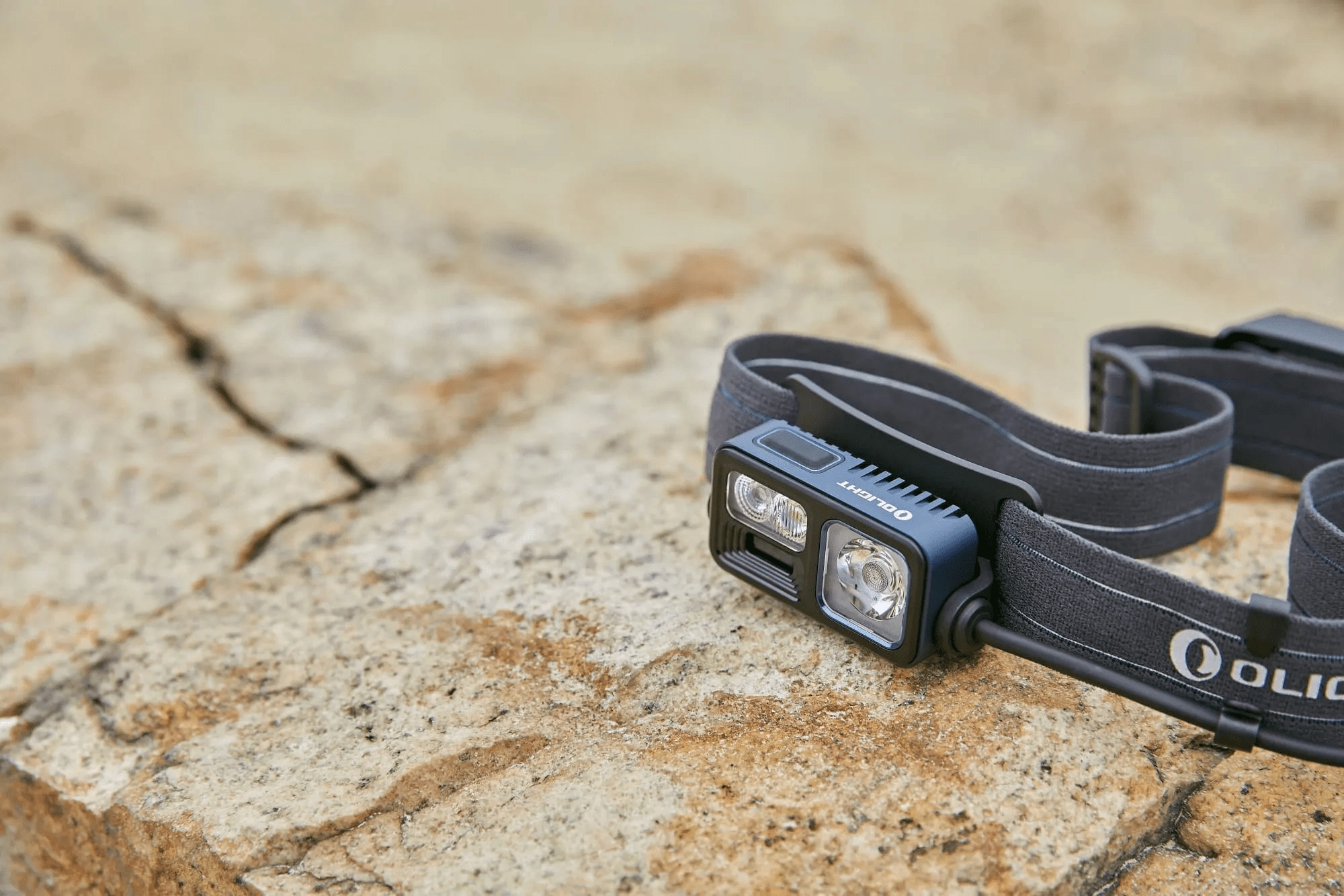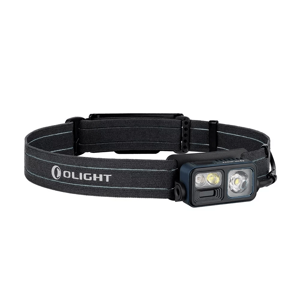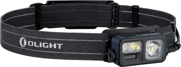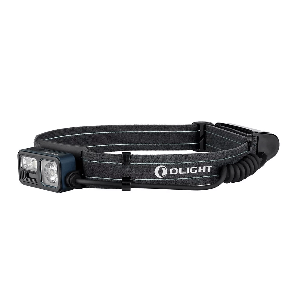 Alsidig pandelampe OLIGHT Array 2S Midnight Blue Limited Edition til løb, camping, klatring og arbejde leverer op til 1000 lm, en rækkevidde på 140 m, berøringsfri gestusstyring og driftstid op til 30 timer takket være det genopladelige 2600 mAh-batteri (USB‑C). Den kombinerer spot- og floodlys, har rødt lys og SOS samt en bageste sikkerhedsindikator på batteripakken.