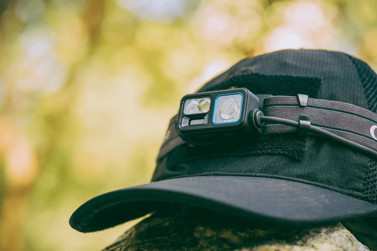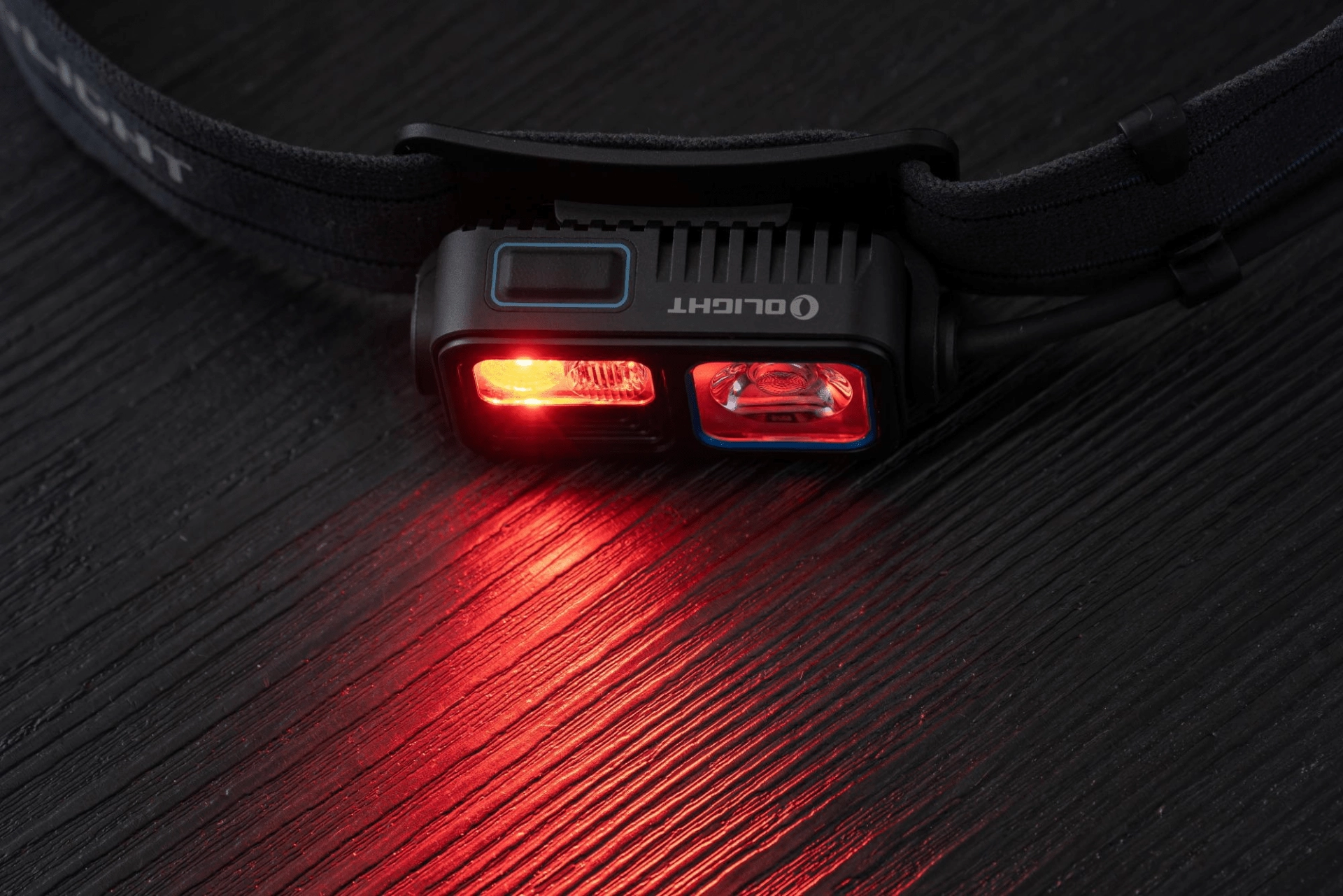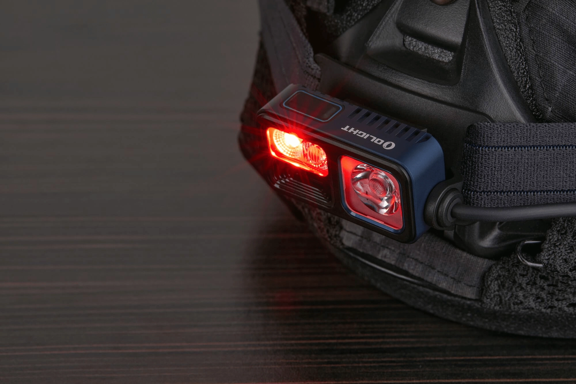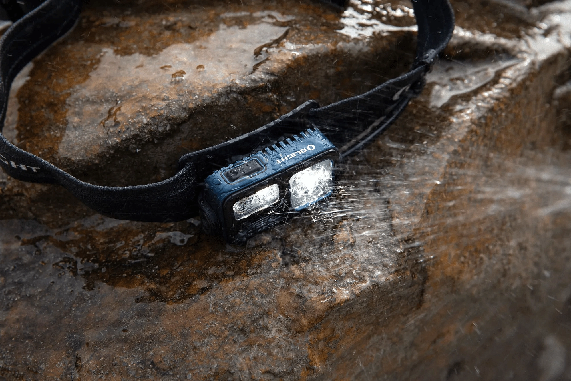 Alsidig pandelampe OLIGHT Array 2S Midnight Blue Limited Edition til løb, camping, klatring og arbejde leverer op til 1000 lm, en rækkevidde på 140 m, berøringsfri gestusstyring og driftstid op til 30 timer takket være det genopladelige 2600 mAh-batteri (USB‑C). Den kombinerer spot- og floodlys, har rødt lys og SOS samt en bageste sikkerhedsindikator på batteripakken.