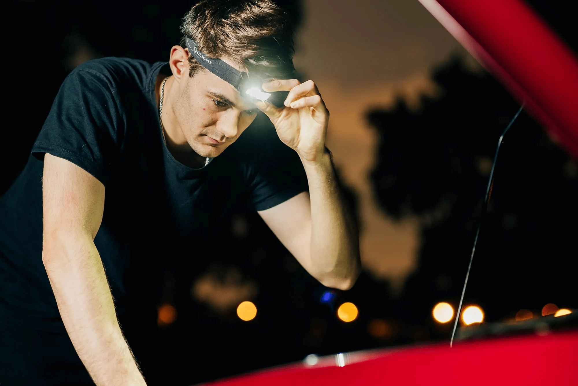Let, svedresistent pandebånd med 60° vippejustering og bageste rødt lys på batteripakken for bedre synlighed og sikkerhed.