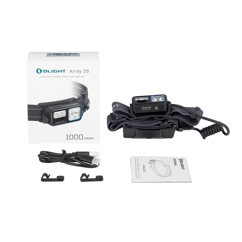 - Pandelampe Array 2S (pandebånd og batteripakke), USB‑C-kabel, brugervejledning