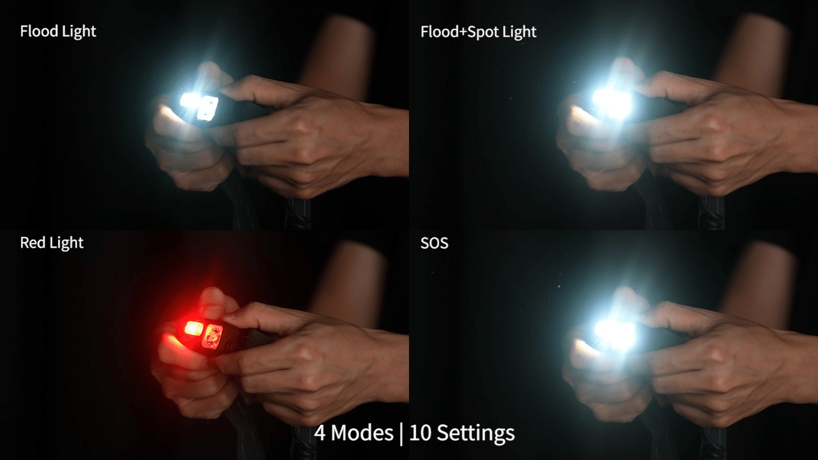 - 4 lysindstillinger: flood, flood + spot, rødt lys, SOS