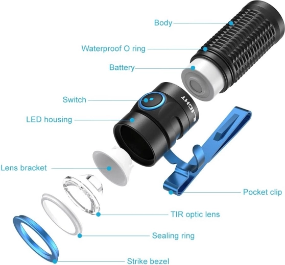 - 5 lysniveauer + strobe til taktisk og EDC-brug