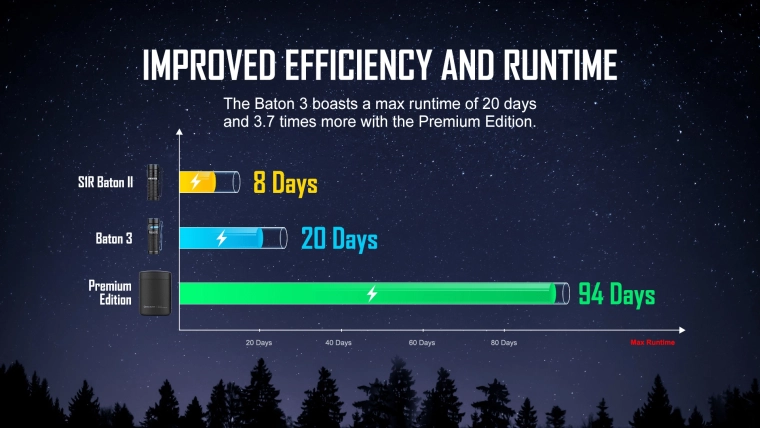 - Op til 20 dages driftstid i månelys-tilstand (0,5 lm)