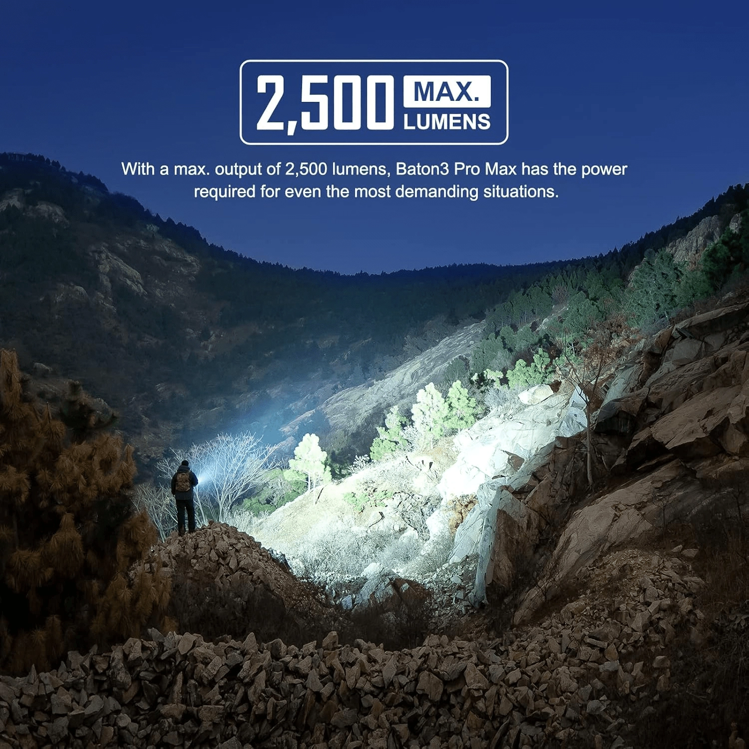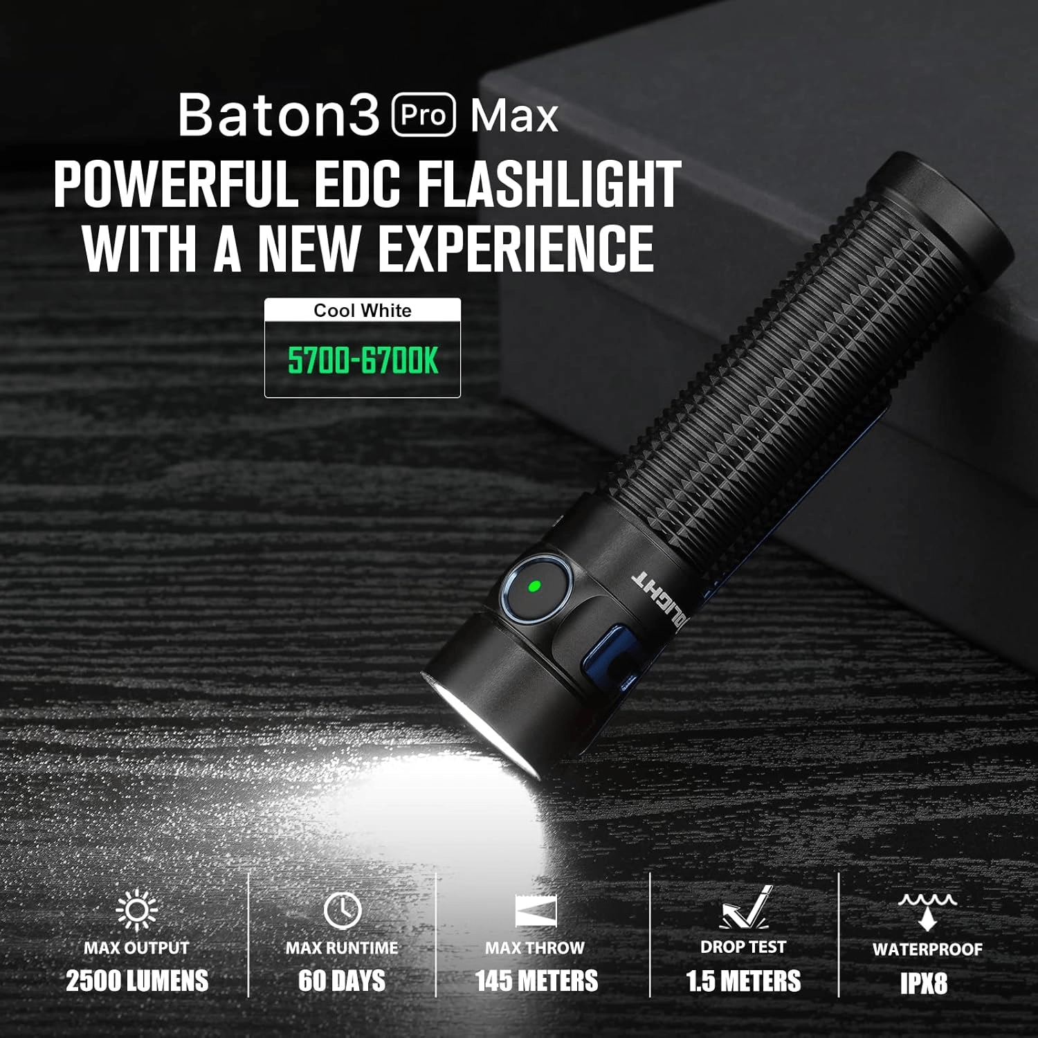 OLIGHT Baton 3 Pro Max er en kraftig EDC-lygte, der kombinerer kompakte mål med en maksimal lysstrøm på 2500 lumen og en rækkevidde på op til 145 meter. Den tilbyder fem lysstyrkeniveauer, en speciel moonlight 1 lm til natbrug og strobe til nødsituationer. En større, let forsænket knap med elektronisk lås minimerer utilsigtet aktivering.
