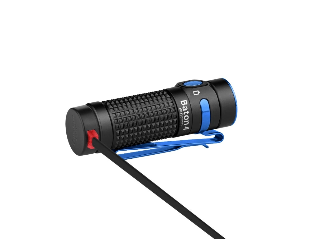 Olight Baton 4 er en kraftig EDC-lygte med rækkevidde op til 170 m og fem tilstande fra Moonlight 0,5 lm til Turbo 1300 lm. Sidekontakten sikrer hurtig valg af tilstande, den teksturerede krop et sikkert greb, og det magnetiske opladningskabel MCC 1A giver bekvem opladning uden at fjerne batteriet.