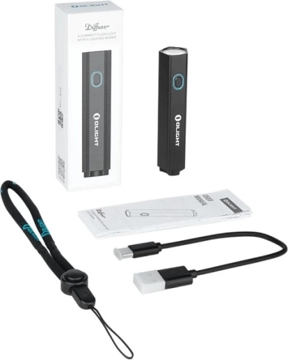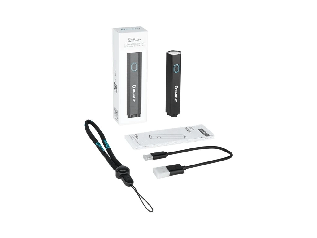 - Olight Diffuse lommelygte (batteri inkluderet), USB‑C-kabel, nakkesnor, brugervejledning