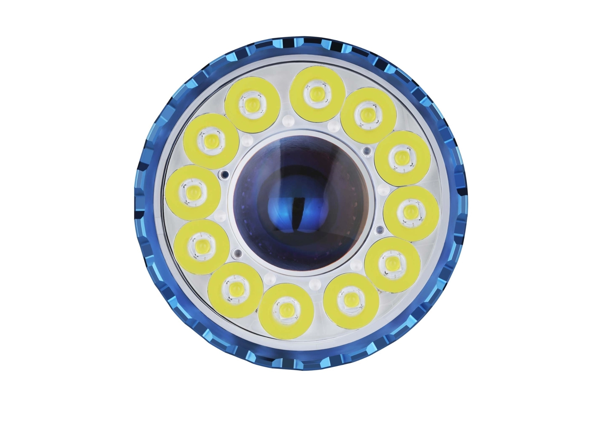 Tolv LED’er til en kraftig flood‑kegle og en central diode til langtrækkende spot med op til 800 m. Med én betjening skifter du mellem flood og spot og vælger blandt 7 lysstyrkeniveauer.