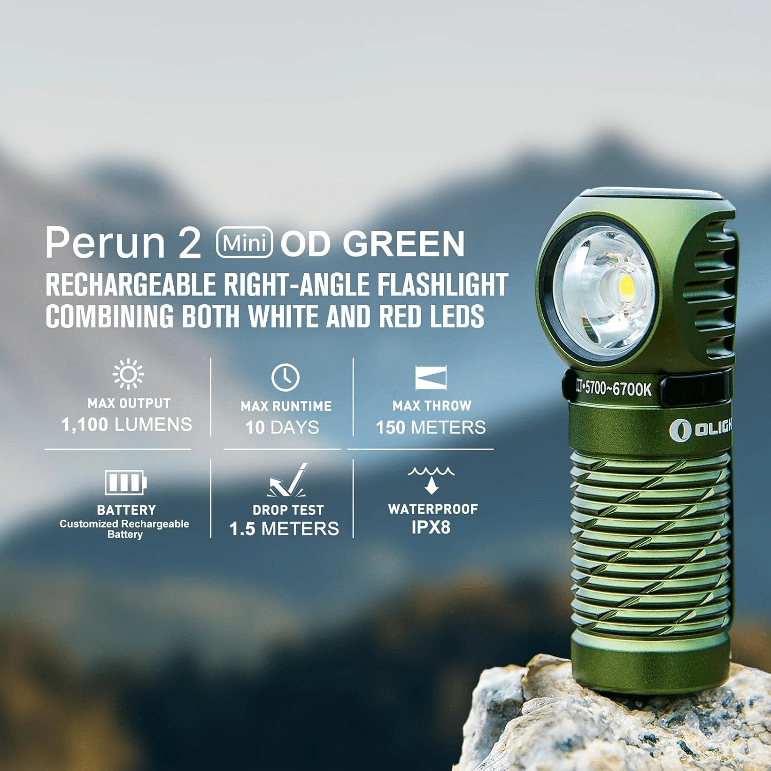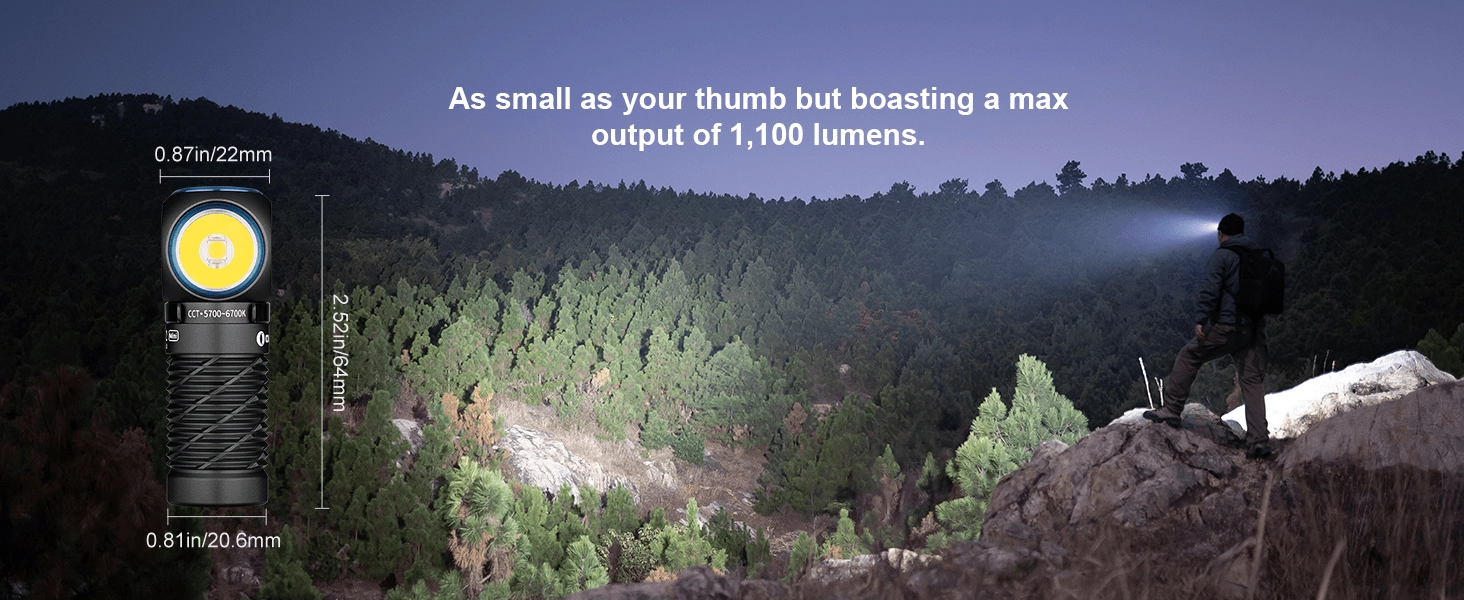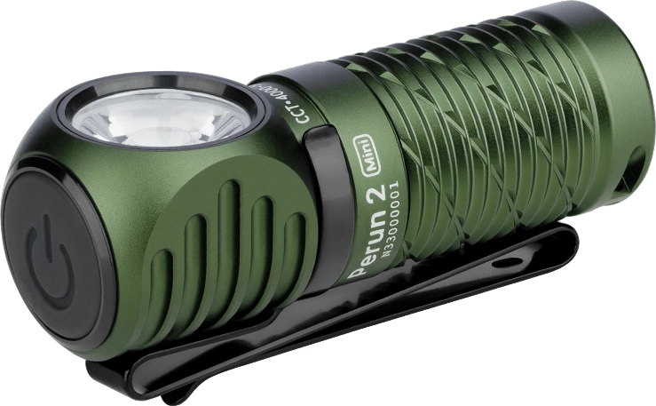 OLIGHT Perun 2 Mini er en multifunktionel pandelygte og lommelommelygte, der klarer hverdagsbrug, udendørs ophold og arbejde i værkstedet. Den tilbyder kraftigt hvidt lys op til 1100 lm med en rækkevidde på 150 m samt praktisk rødt lys til at bevare nattesyn eller nødsignalering. Takket være det retvinklede hoved, magnetisk bagende og robust klip kan den nemt bruges på pandebånd, kasketskygge, rygsækrem eller fæstnes på en metaloverflade.