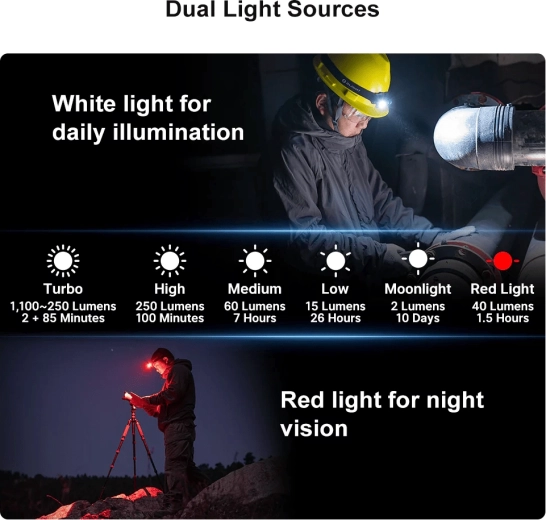 Kraftig hvid LED til arbejde og outdoor, rød LED til at bevare nattesyn og til nødsignalering. Fleksibelt valg til enhver situation.