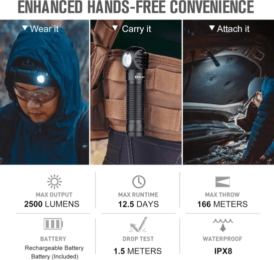Olight Perun 2 kombinerer ydelse, sikkerhed og komfort. Det retvinklede hoved med en højtydende LED giver en bred og klar lyskegle på op til 2500 lumen, mens nærhedssensoren automatisk regulerer intensiteten for at forhindre blænding og overophedning. Det robuste hus i flyaluminium med markant tekstur ligger sikkert i hånden – også med handsker.